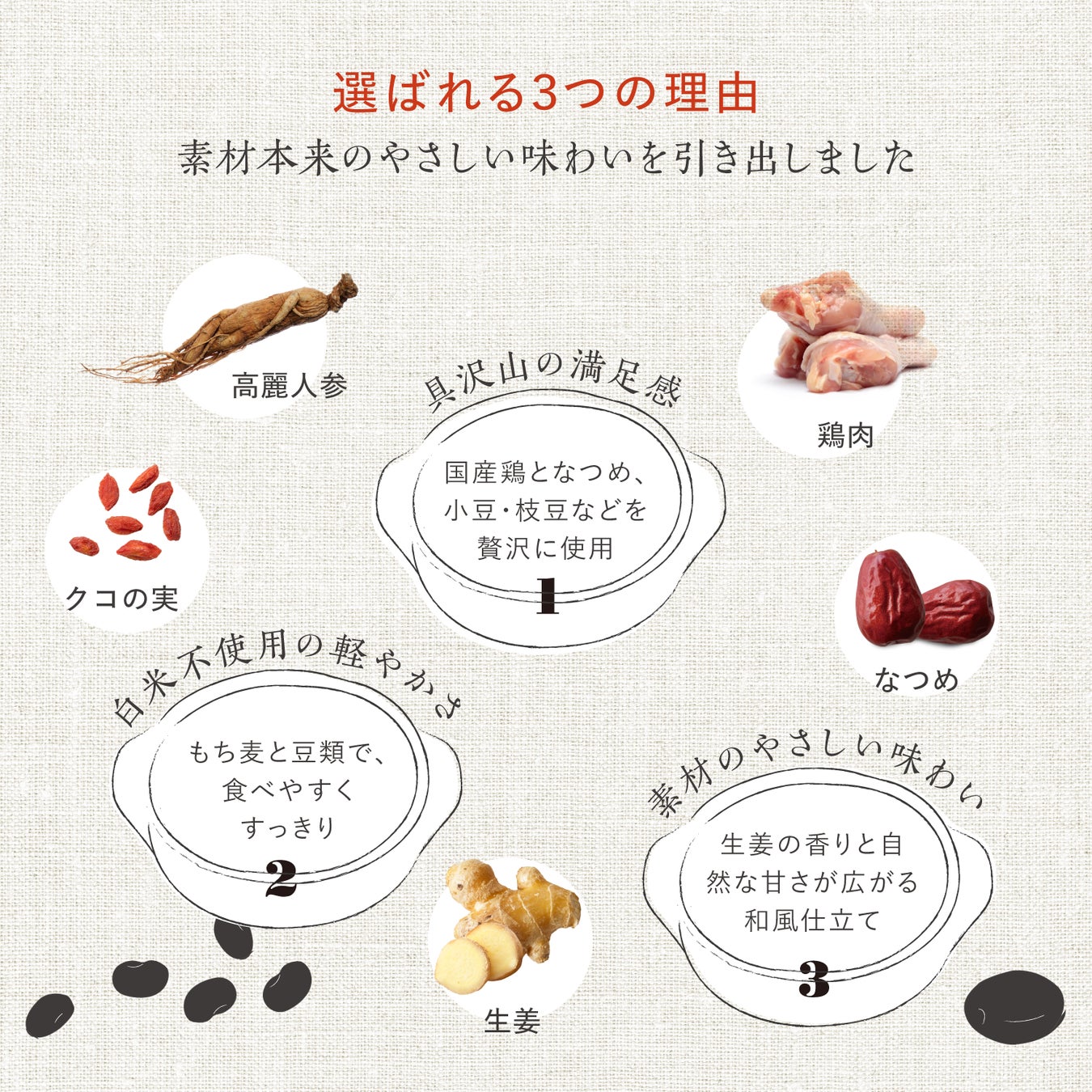 生姜の香りと、なつめ・小豆の自然な甘さが調和した、やさしく奥行きのある和風サムゲタン風味。