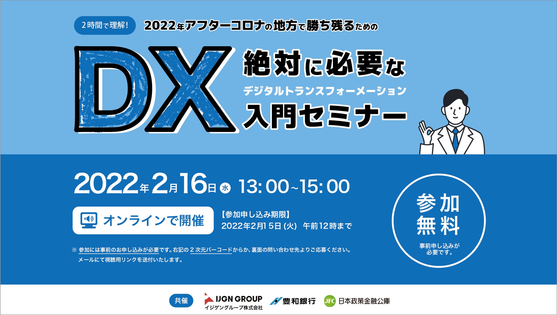 イジゲングループ株式会社(本社:大分県大分市、代表取締役:鍋島佑輔、鶴岡英明、以下イジゲングループ)は大分市内で豊和銀行および日本政策金融金庫と共催で「2022年アフターコロナの地方で勝ち残るための絶対に必要なDX入門ウェビナー」を開催いたします。