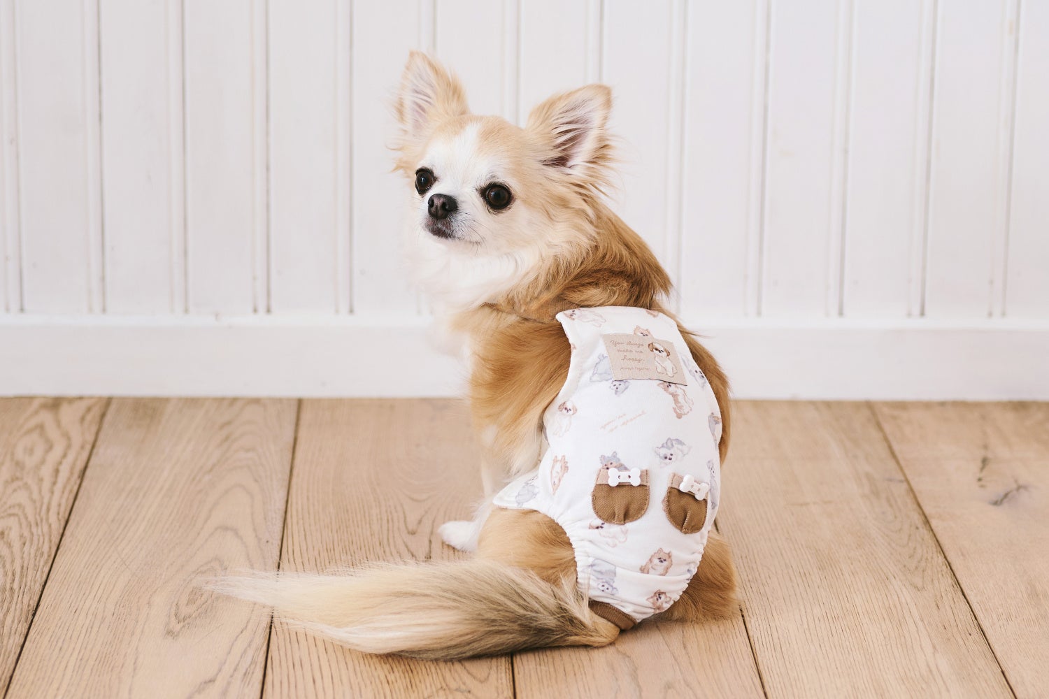 排泄が困難になった愛犬も、おしゃれを楽しみ快適に過ごせるオーバーオール風デザインのマナーウェア。足を通さずに、お腹側での固定だけで楽に着せられるやさしい設計です。