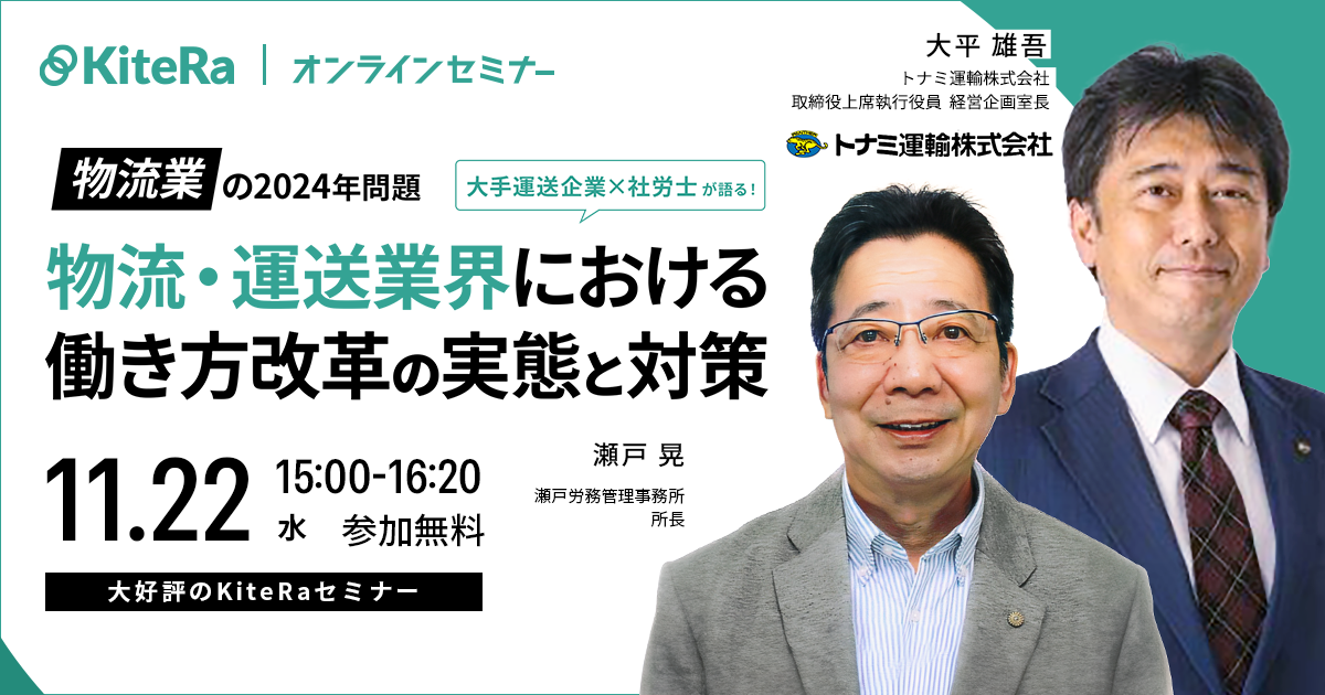 当日は、大手運送企業のトナミ運輸株式会社 取締役上席執行役員 経営企画室長 大平氏と、多くの運送企業を支援してきた瀬戸労務管理事務所 所長の瀬戸氏が登壇し、『物流2024年問題』に対してこれまでどのような対応や支援を行ってきたのか、発生した課題とその課題と解決策について、実例も交えて解説します。セミナー終盤には当社も交えた3者による『物流2024年問題』をテーマとしたディスカッションも行います。