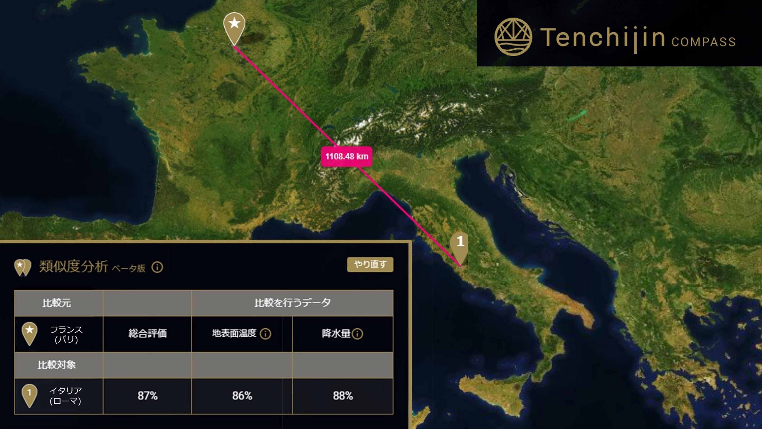 この度、「類似度分析機能」*と「計測機能」を追加しました。「類似度分析機能」は、衛星から取得した時系列の気象データ(地表面温度、降水量)を用いて、値の変化の仕方や値の大きさの類似性を総合的に評価し、離れた2地点の ”似ている度合い” を定量的に表現します。