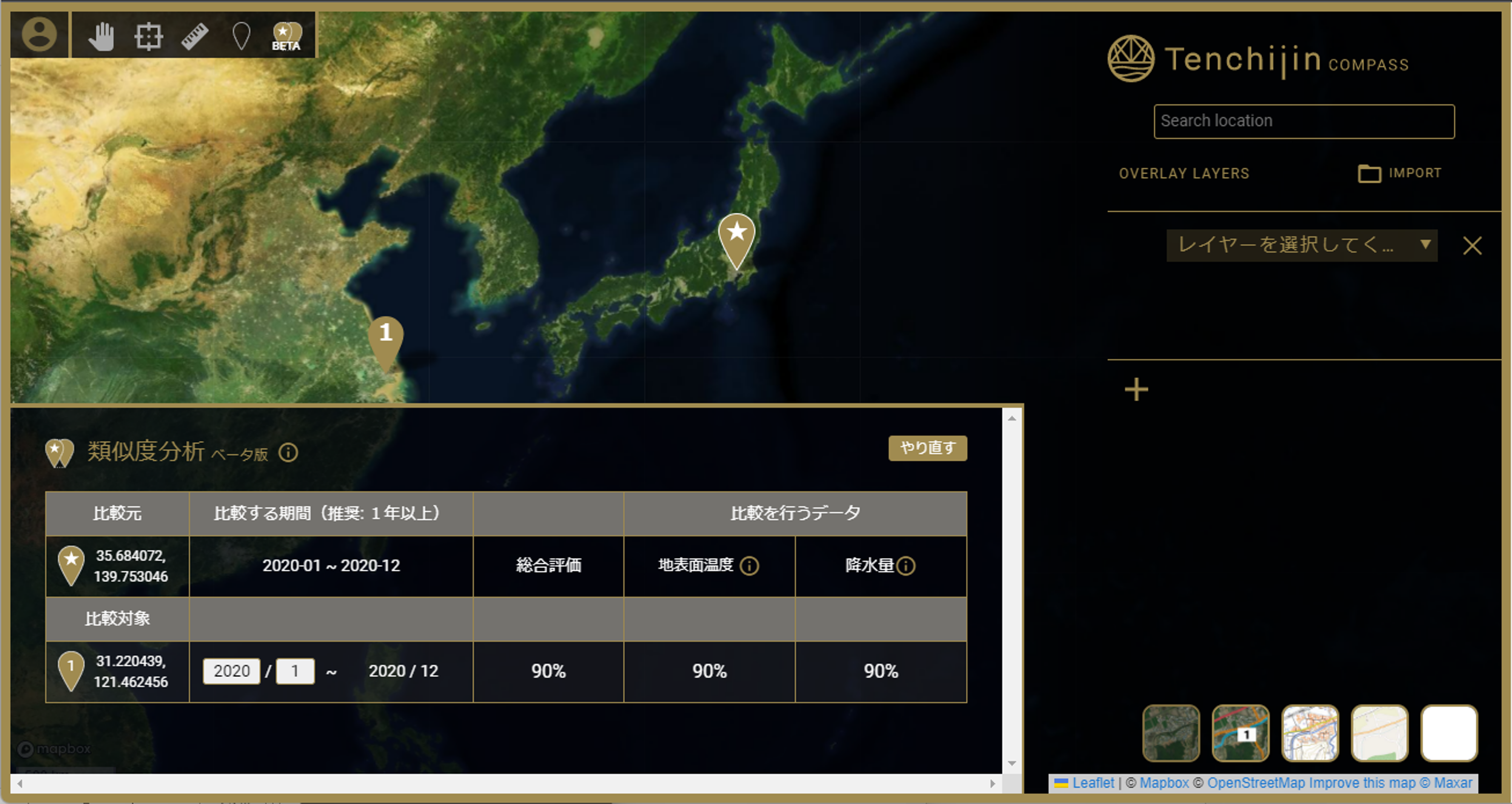 自由に指定できる2つの地点が、どのくらい似ているのかをパーセントで算出可能です。類似度を算出するために使う条件として、地表面温度、降水量*を選択できます。なお、期間について、分析精度を担保するために、1年以上の期間を指定することを推奨しています。