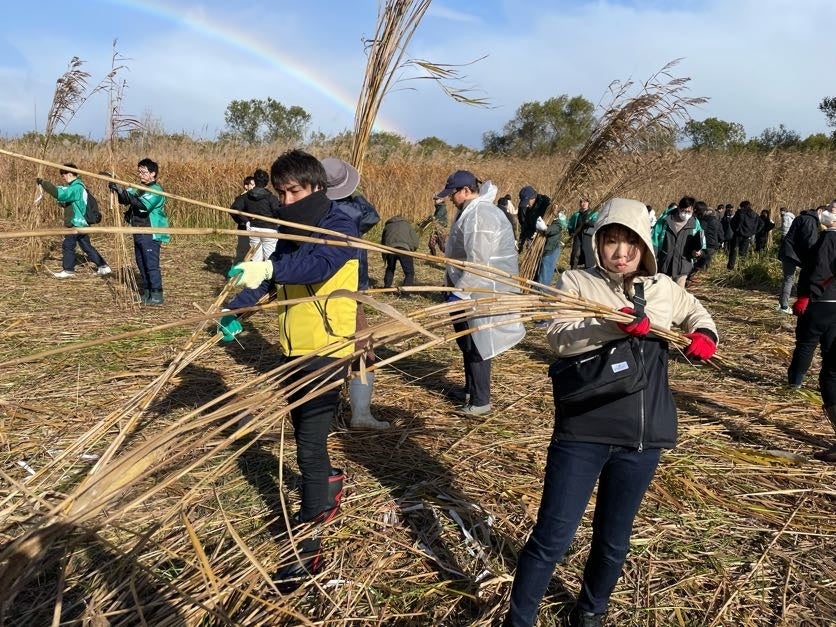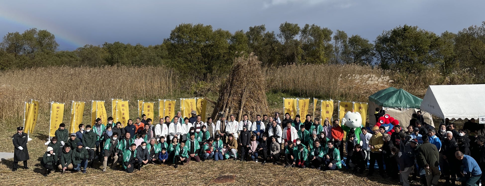 株式会社たまゆら(所在地:大阪府枚方市 代表取締役 岡本 哲 以下弊社)は、2023年12月2日(土)に滋賀県高島市で2025年に開催される大阪・関西万博のユニフォームを地元関西のヨシ刈りからつくるイベント「びわ湖岸ヨシ刈りからはじめるSDGs・MLGs2023」を行った。ヨシ刈りは、びわこ高島のヨシを守る会(所在地:滋賀県高島市 会長 中村 正博)と連携し行った。万博を控えた今回の刈取りはおよそ170名を超えるボランティアが参加し開催された。同イベントではびわ湖のヨシから作られた生地が採用されたことを記念するセレモニーも開催され、高島市福井市長をはじめ多くの参加があった。ヨシとは、琵琶湖の消波・浸食防止作用を持ち、鳥類・魚類をはじめとした多様な生物に住処を提供、また水質の保全をしている。単年で育つヨシは育成過程でCO2を閉じ込める性質があり、収穫することによりカーボンオフセットにも貢献する。今回固定したCO2は3.27tであり、これは普通自動車の東京-大阪間15往復分に相当する。