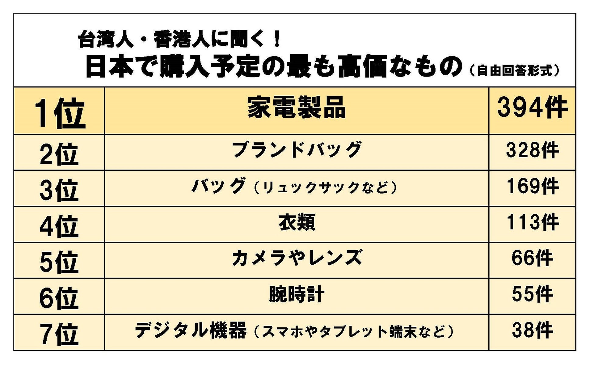 日本で購入する予定の高価な物 1位は「家電製品」 春節を前に台湾人・香港人に調査 2000人以上が回答