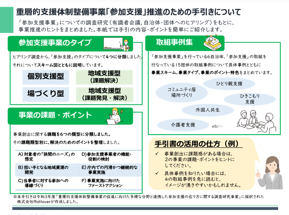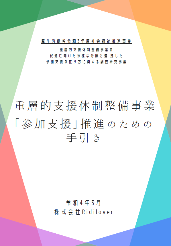 株式会社Ridilover(以下、「リディラバ」代表取締役:安部敏樹)は、厚生労働省令和3年度社会福祉推進事業(国庫補助事業)に採択され、「重層的支援体制整備事業の促進に向けた多様な分野と連携した参加支援の在り方に関する調査研究事業」(以下、「本事業」)を実施しています。このたび、その調査の成果物として、重層的支援体制整備事業「参加支援」推進のための手引きを作成、公開しました。