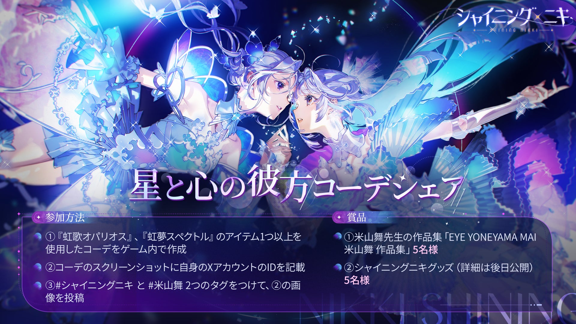 ▶応募方法: キャンペーン期間中「#シャイニングニキ」と「#米山舞」のタグをつけて、イベントコーデ『虹歌オパリオス』、『虹夢スペクトル』のアイテム1つ以上を使用したコーデを投稿することで応募完了です。 詳細は、『シャイニングニキ』公式X(旧Twitter)をご確認ください。