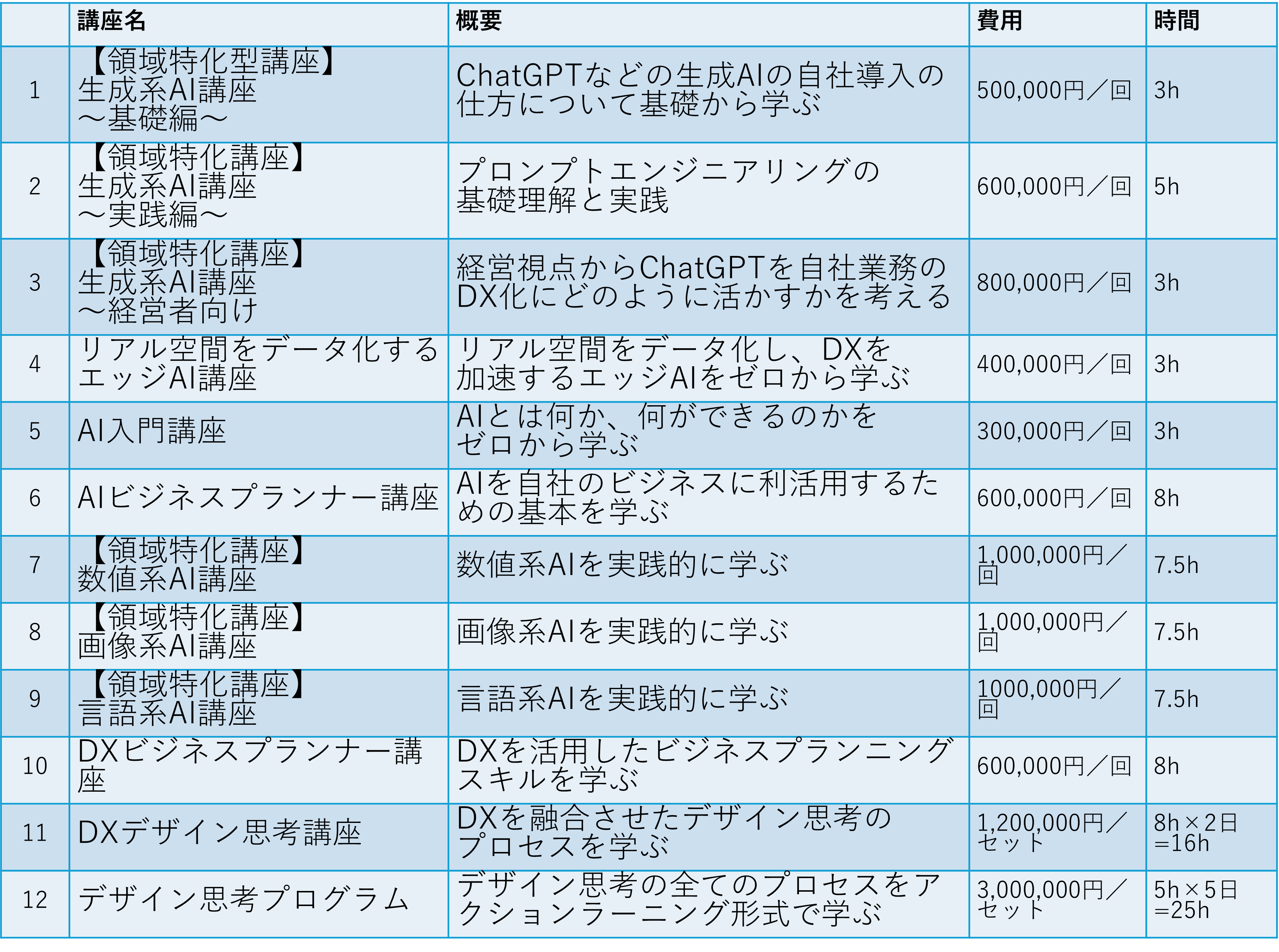 この2社共同取り組みの第一弾として、生成AIの基礎知識から幅広いAI、機械学習の理解と活用、特にChatGPT等の生成AIと各種AIソリューションを組み合わせて使いこなす実践的な教育プログラムの提供を行い、現場DXの実現を支援します。両社の強みを活かすことで現場のリアルとデジタルを融合したOMO、デジタルツィンといった、これまでにないサービスや体験までもが実現可能となるプログラムとなっております。
