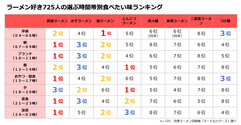 「ラーメン、この時間に食べるならこの味!」ラーメン好き725人の選ぶ時間帯別食べたい味ランキング