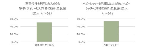 ベビーシッター、家事代行をを利用したことがある人を対象に、使ったことのあるサービスの中で「特に助かったサービス」として回答が多かったものをみると、それぞれ50%以上の人がそのサービスを「特に助かった」と回答。ベビーシッターおよび家事代行を利用したことがあるワーキングマザーは約20%にとどまるものの、利用した人の半数以上は満足していることが分かります。