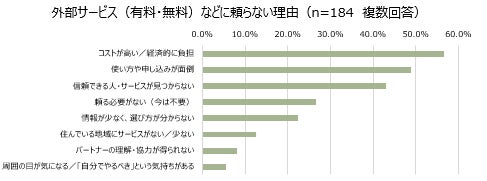 外部サービスなどに頼らない理由を回答した184人のうち、56.5%の人が「コストが高い/経済的に負担」と回答、続いて約48.9%の人が「使い方や申し込みが面倒」と回答しました。