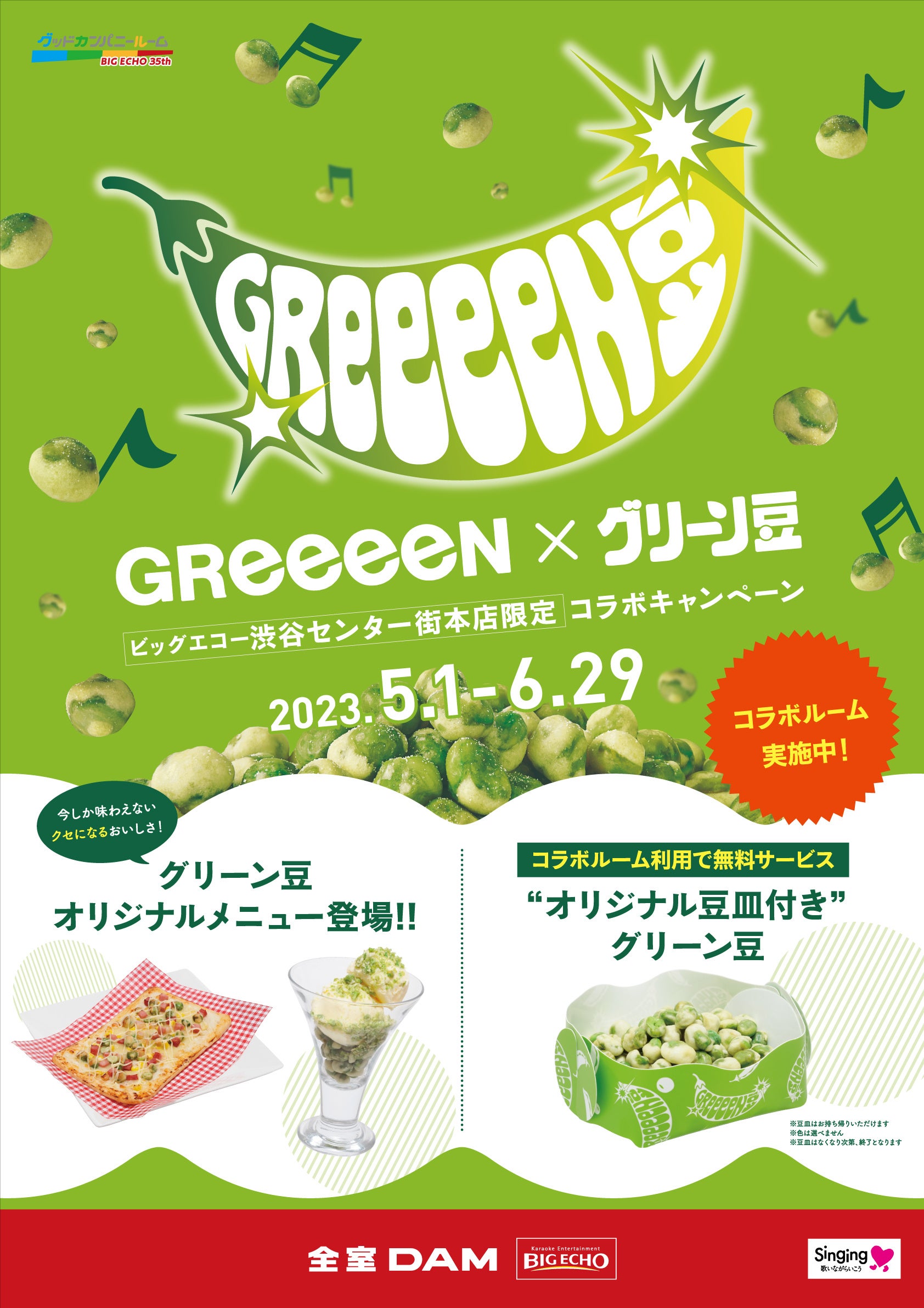 GReeeeN×グリーン豆 コラボレーション企画の1つとして音楽を通してグリーン豆をお楽しみいただきたいとの想いから、株式会社第一興商が運営するカラオケルーム ビッグエコーとタイアップした「グリーン豆コラボルーム」を開設します。お部屋は今回のキャンペーンのシンボリックデザインである“GReeeeN豆”ロゴをモチーフに装飾し、コラボルームをご利用のお客様には、「オリジナル豆皿付きグリーン豆」をプレゼントします。* また、グリーン豆を用いたピザ、おつまみ、アイスなどのスペシャルメニューを、コラボメニューとして同店限定で販売します。