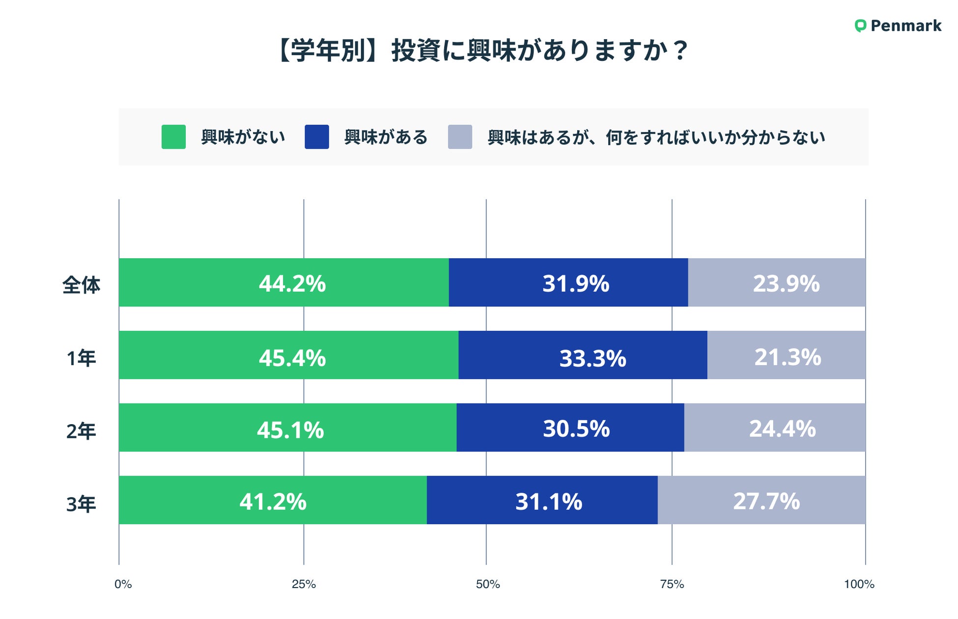 学年別では、「投資に興味がある」と回答した1年生は33.3%、2年生は30.5%、3年生は31.1%。そして、「興味はあるが、何をすればいいか分からない」と回答した生徒の割合は、1年生が21.3%、2年生が24.4%、3年生が27.7%と、学年が上がるにつれて若干増えている。
