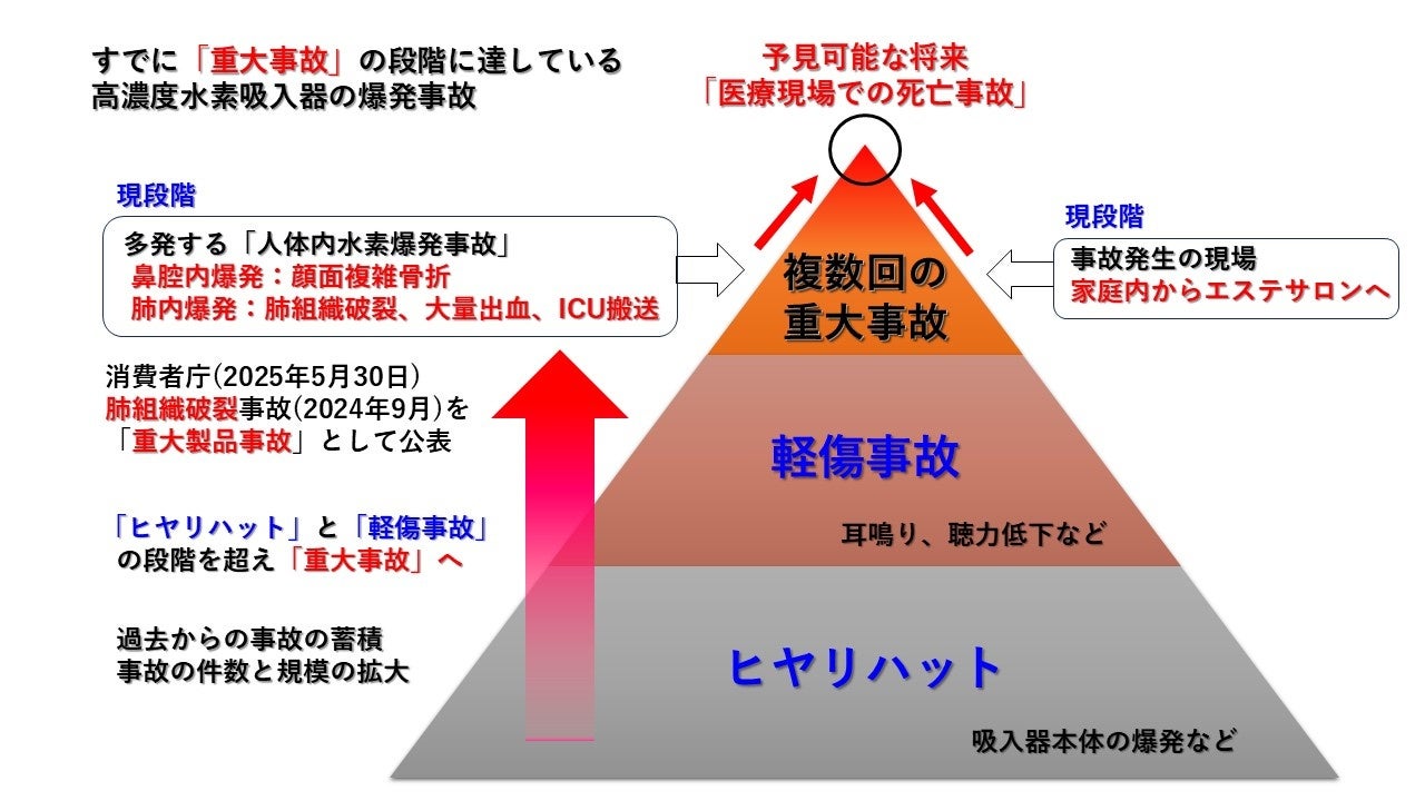 これらの事故について「ハインリッヒの法則」に当てはめてみると、高濃度水素の爆発事故は、消費者庁からも「重大製品事故」に認定された事例もあり、すでに「ヒヤリハット」や「軽傷事故」の段階を超えて「重大事故」の段階に達していると言えます。また「1件の重大事故」どころか「複数回の重大事故」が発生していることから、今後さらに深刻な事故が発生する条件がすでに整っていることを示しています。