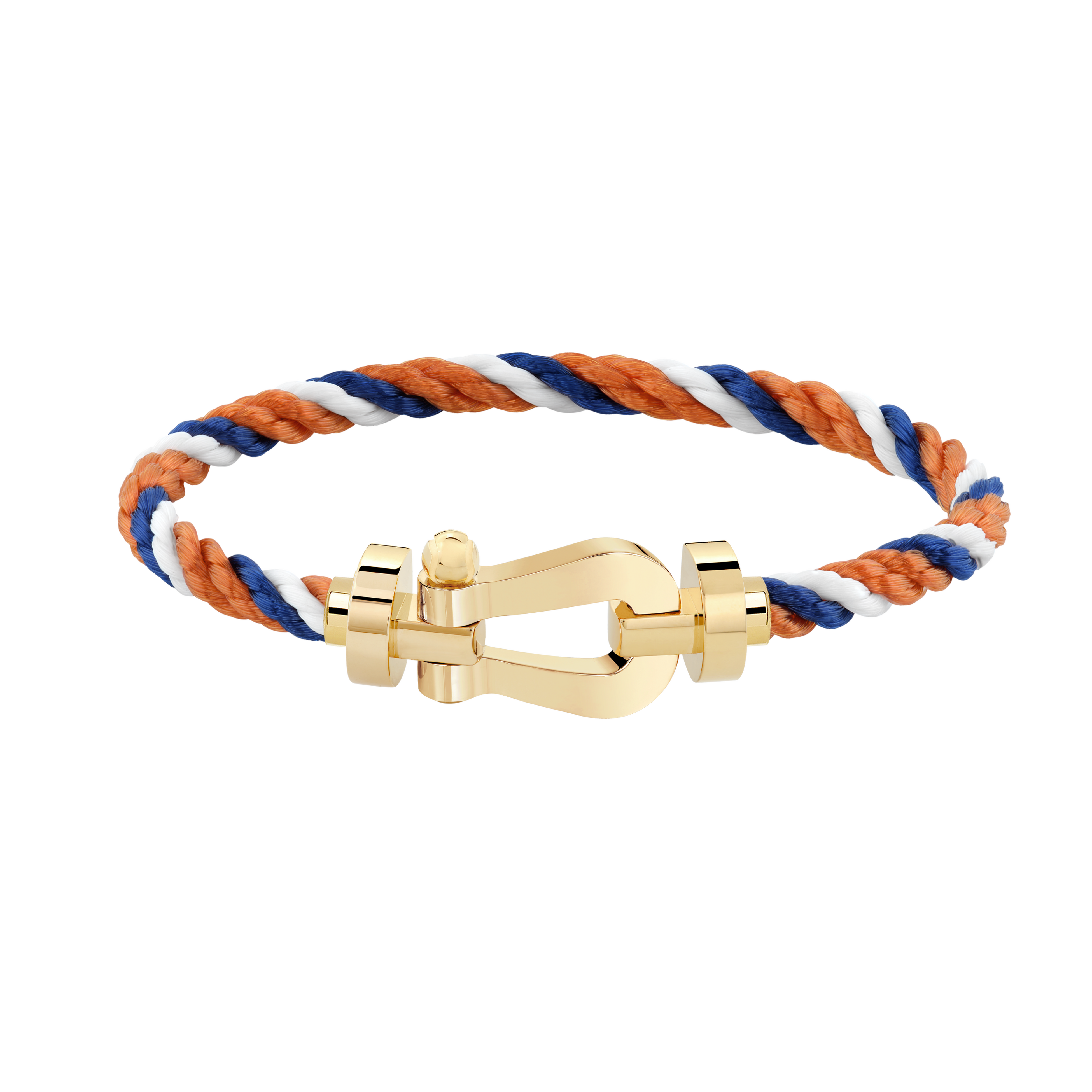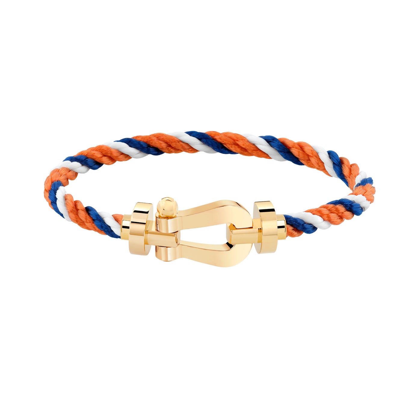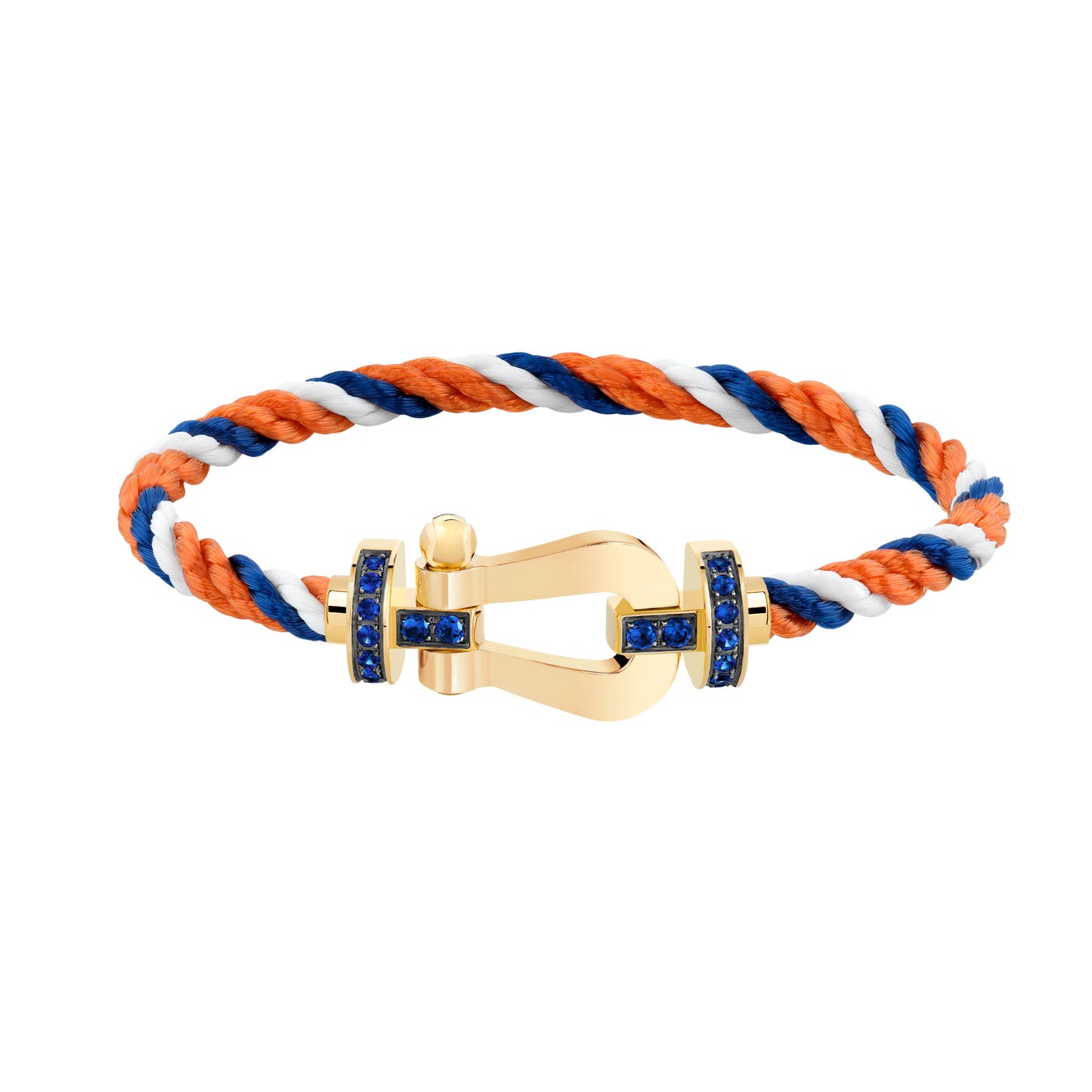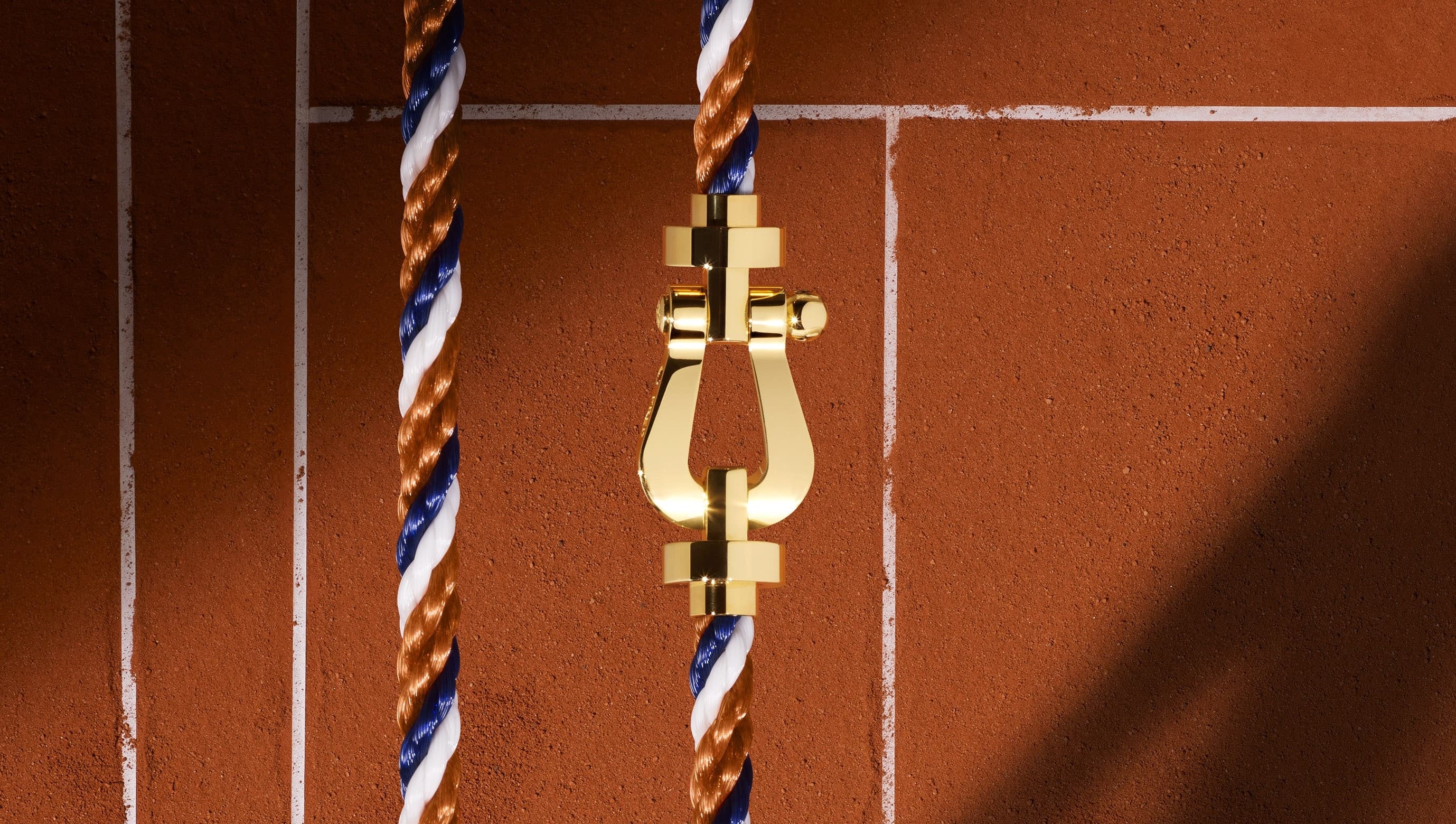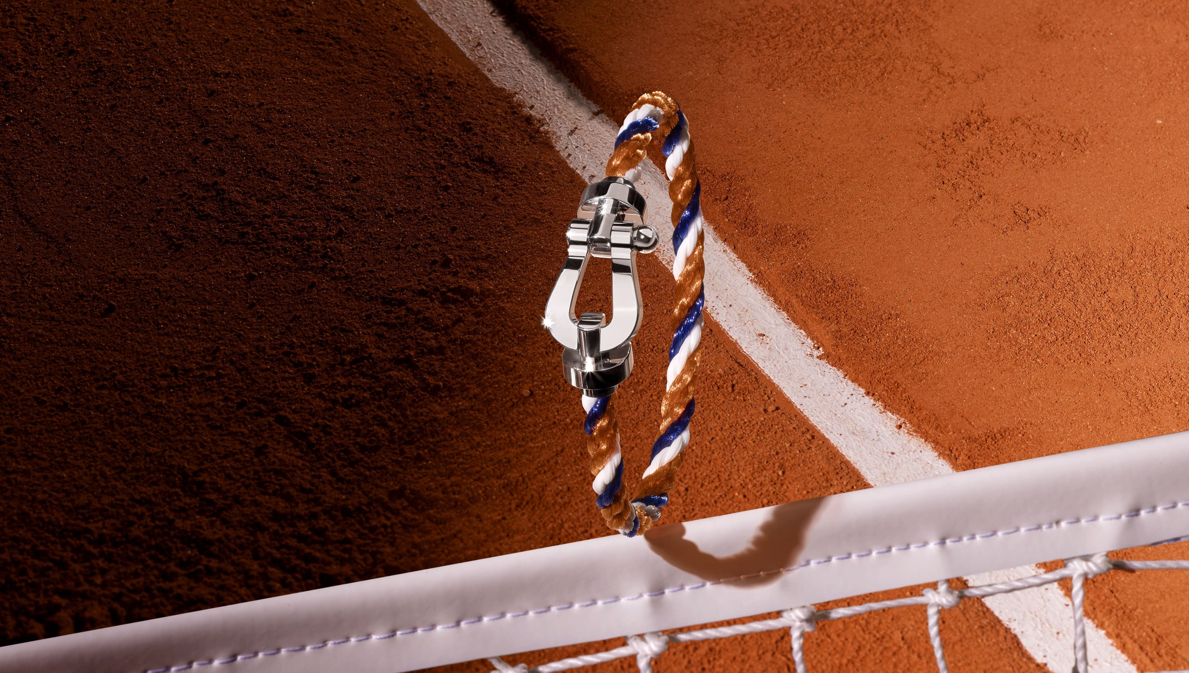 先端に同じローラン・ギャロス エンブレムが刻印された今年のフォース10 ケーブルは、テラコッタ・ホワイト・ブルーの3色の鮮やかな新色を組み合わせました。大胆なカラーリングのケーブルとバックルは、フォース10 ブレスレットの伝統である互換性を守り、組み合わせはもちろんのこと、アイコニックなデザインが提供する千差万別のバリエーションで、時代や流行を超えて遊ぶことができます。