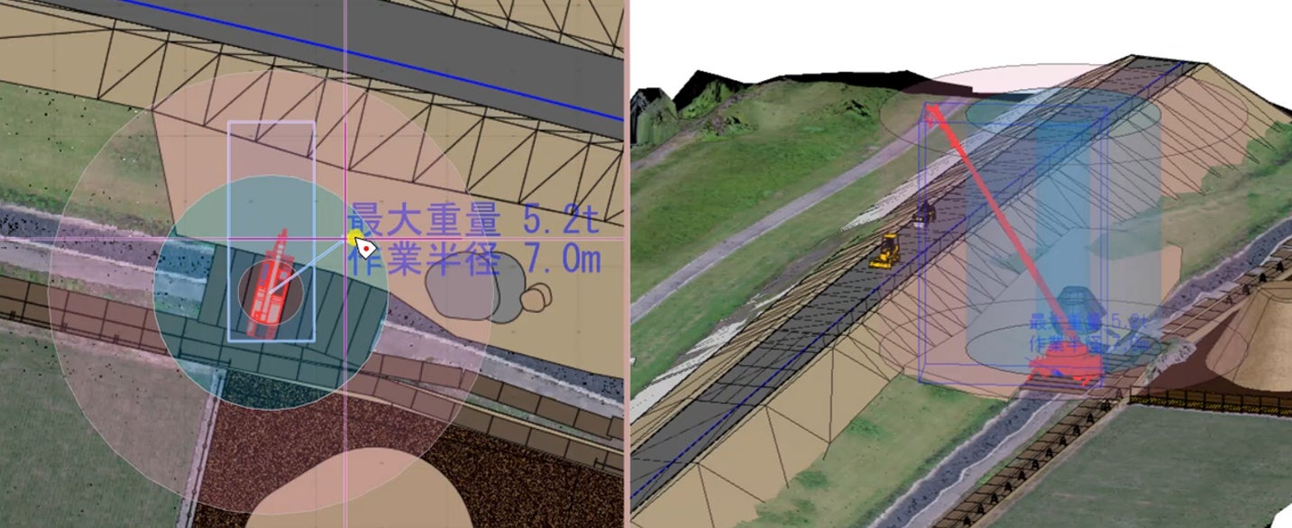 従来、2D図面だけでは十分に表現できなかった高さなどの情報を3Dで可視化することで、電線などの周辺設備との干渉リスクや取り合いを具体的に検討することができ、手戻りを削減します。