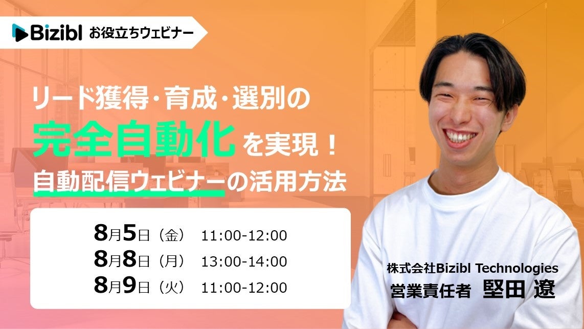 株式会社Bizibl Technologies(本社:大阪市北区、代表取締役:花谷燿平、以下当社)は、『【リード獲得・育成・選別の 完全自動化 を実現!】自動配信ウェビナーの活用方法』と題したお役立ちウェビナーを、2022年8月5,8,9日に開催いたします(内容は全て同一です)。
