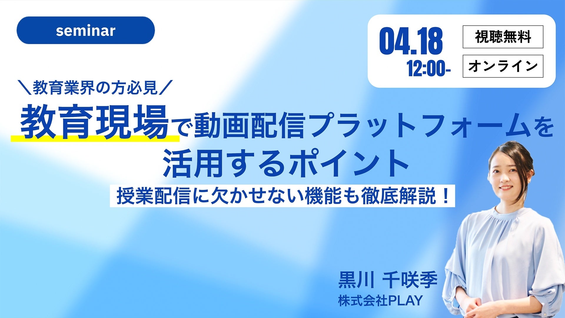 この度株式会社PLAYは、4月18日(火)12:00〜開催するセミナー「教育現場で動画配信プラットフォームを活用する前に押さえておきたいポイント 授業配信に欠かせない機能も徹底解説!」の申し込みページを公開しました。