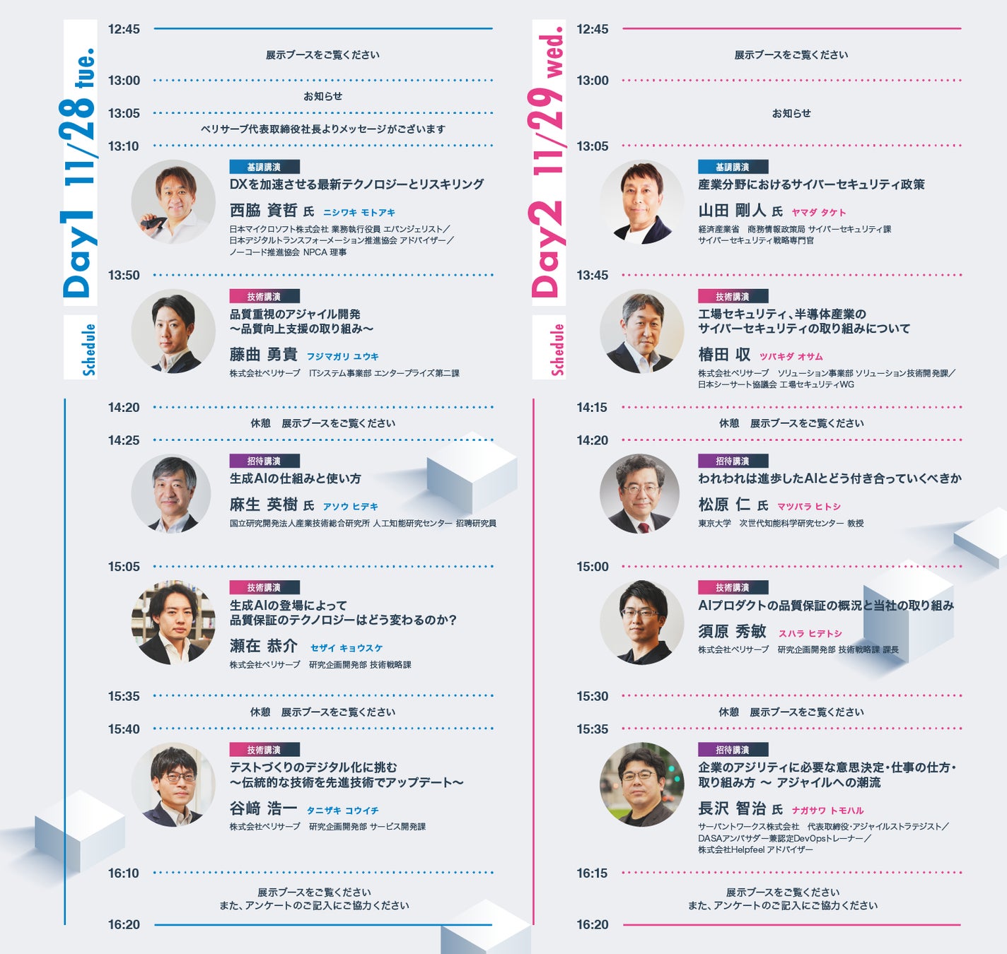 23回目の開催となる今回のカンファレンスのテーマは『イノベーションを加速させる、先進技術の「活用」のために』です。次々と革新されるテクノロジーによって、加速度的に変容しつつある現代社会。今や、先進技術の探求だけでなく、それを活用することがあらゆる企業活動のテーマとなりました。イノベーションの最前線で品質技術の開発と実装を進めるベリサーブがお届けする本カンファレンスは、産官学の各方面からゲストをお招きし、 AIやDX、サイバーセキュリティといった最新技術の探究と活用を、あらゆる業種の方々にご提供することで、皆様の課題解決やイノベーションに貢献します。