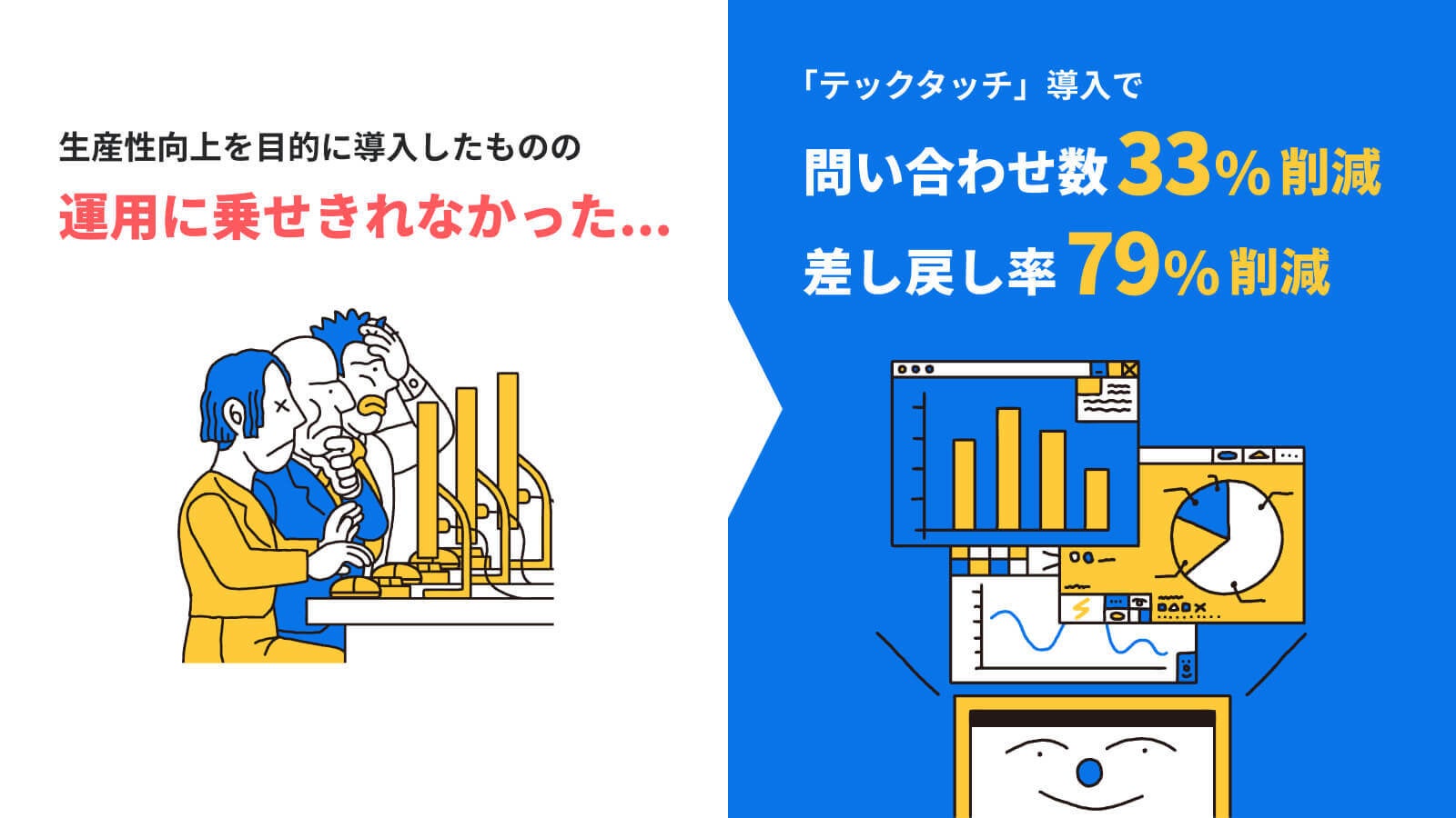 当テンプレートはすでに10社にて先行で利用されています。「テックタッチ」導入前後で問い合わせ率33%削減、差し戻し率79%削減を実現された企業様もいらっしゃいます。