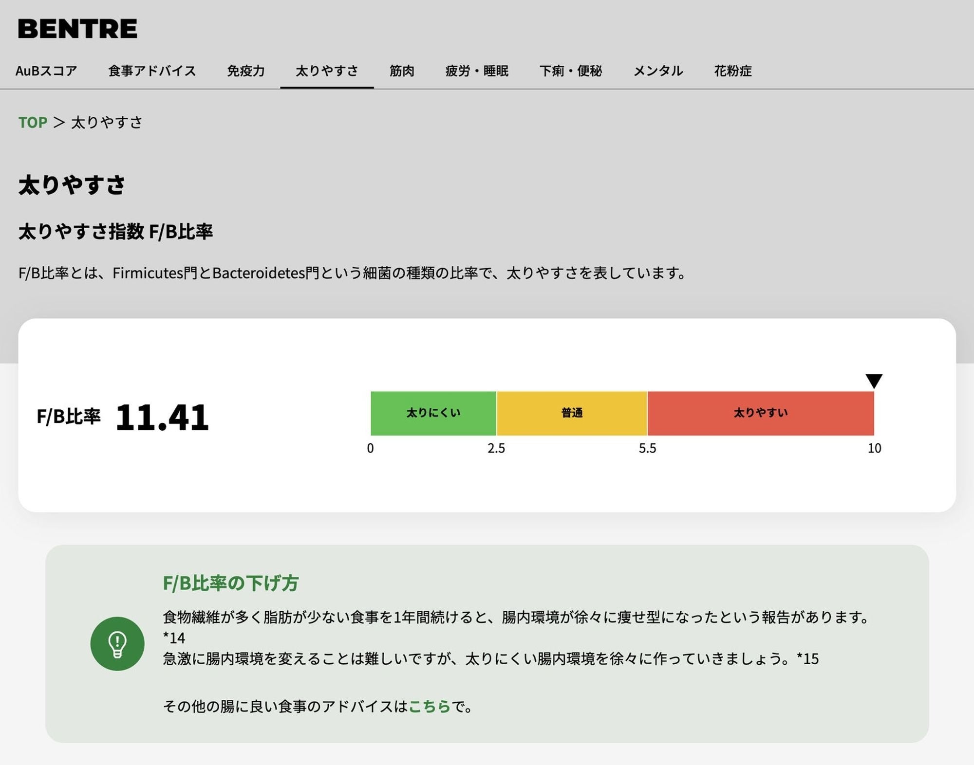 腸内細菌の解析結果のうち、AuBが重要と考えている3つの指標をもとに評価を行う独自のスコアを開発しました。