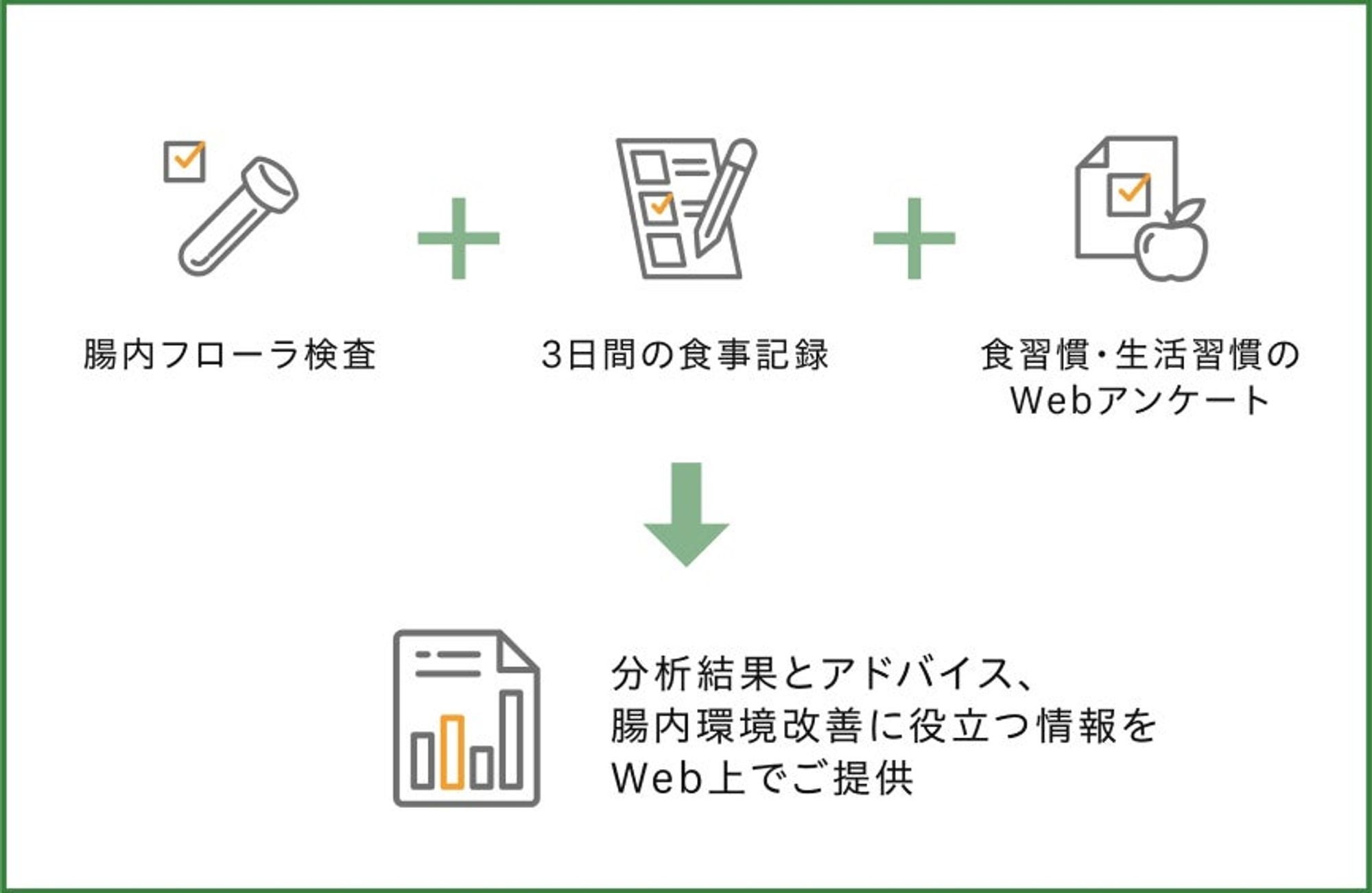 事前にご回答いただいた3日間の食事情報と食事アンケートの結果をもとにした評価とアドバイスをご提供します。 また、腸内環境をケアするための食事やサプリメントの考え方に関する情報もご提供します。