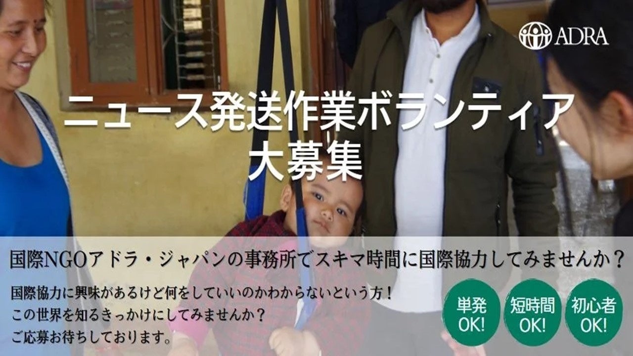 ウクライナ人道支援など、世界各地の紛争・災害被災地や途上国において、一人ひとりに寄り添う支援活動に取り組んでいる認定NPO法人 ADRA Japan(アドラ・ジャパン、所在地:東京都渋谷区神宮前1-11-1)は、2023年2月28日~3月9日まで支援者の方にお届けする「ADRA News」の発送作業をお手伝いくださるボランティアを募集します。