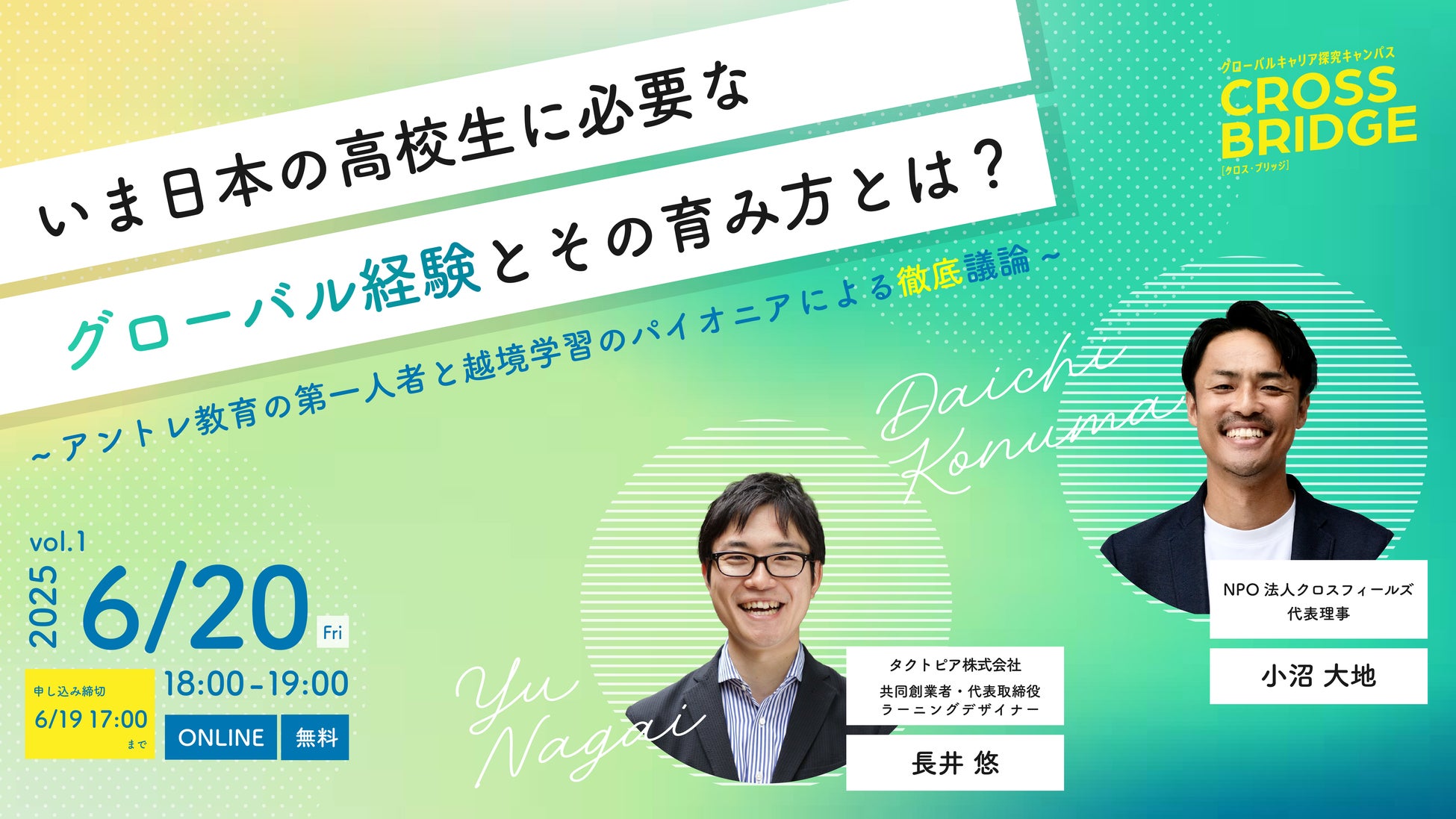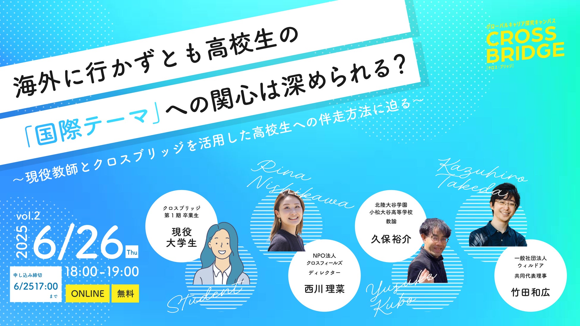 <第二回> 6/26 (木) 18時開催 ゲストにwilldoor竹田氏、小松大谷高校 久保氏ほか「海外に行かずとも高校生の"国際テーマ"への関心は深められる?〜現役教師とクロスブリッジを活用した高校生への伴走方法に迫る〜」
