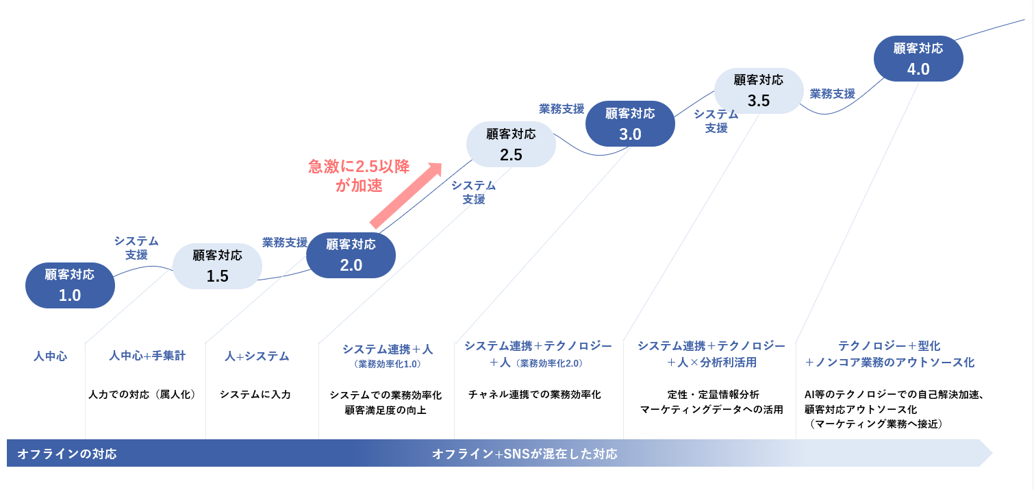 「Discoveriez」をご利用のクライアント様が主領域とする顧客対応業務は、テクノロジーやコミュニケーションチャネルの発達とともに高度化しており、人が中心となる顧客対応フェーズ(顧客対応1.0)を起点に、人・システム・テクノロジーの連携により業務効率化を実現した顧客対応フェーズ(顧客対応3.0)、近年では、自律型AIによる完全自己解決を目指す顧客対応フェーズ(顧客対応4.0)が登場するなど、その種類は益々多様化しています。それに伴い、顧客対応における企業課題も、複雑化・多様化しつつあります。