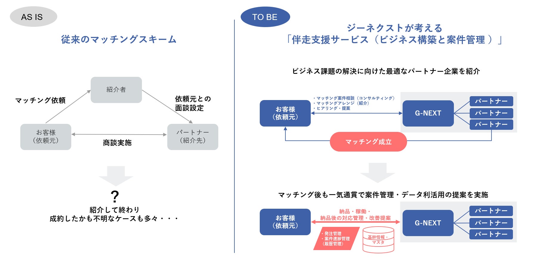 取り組みの第一弾としては、クライアント様のビジネス課題の解決に向けた最適なパートナー企業を紹介し、その後の案件管理からデータ利活用の提案まで一気通貫で支援する「伴走支援サービス」を提供します。