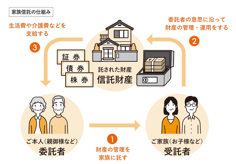 家族などの信頼できる第三者に自分の財産の管理権限を委託し、財産を所有する本人に代わって管理してもらう制度です。本人や家族の希望に沿って、柔軟な資産管理を行うことができます。