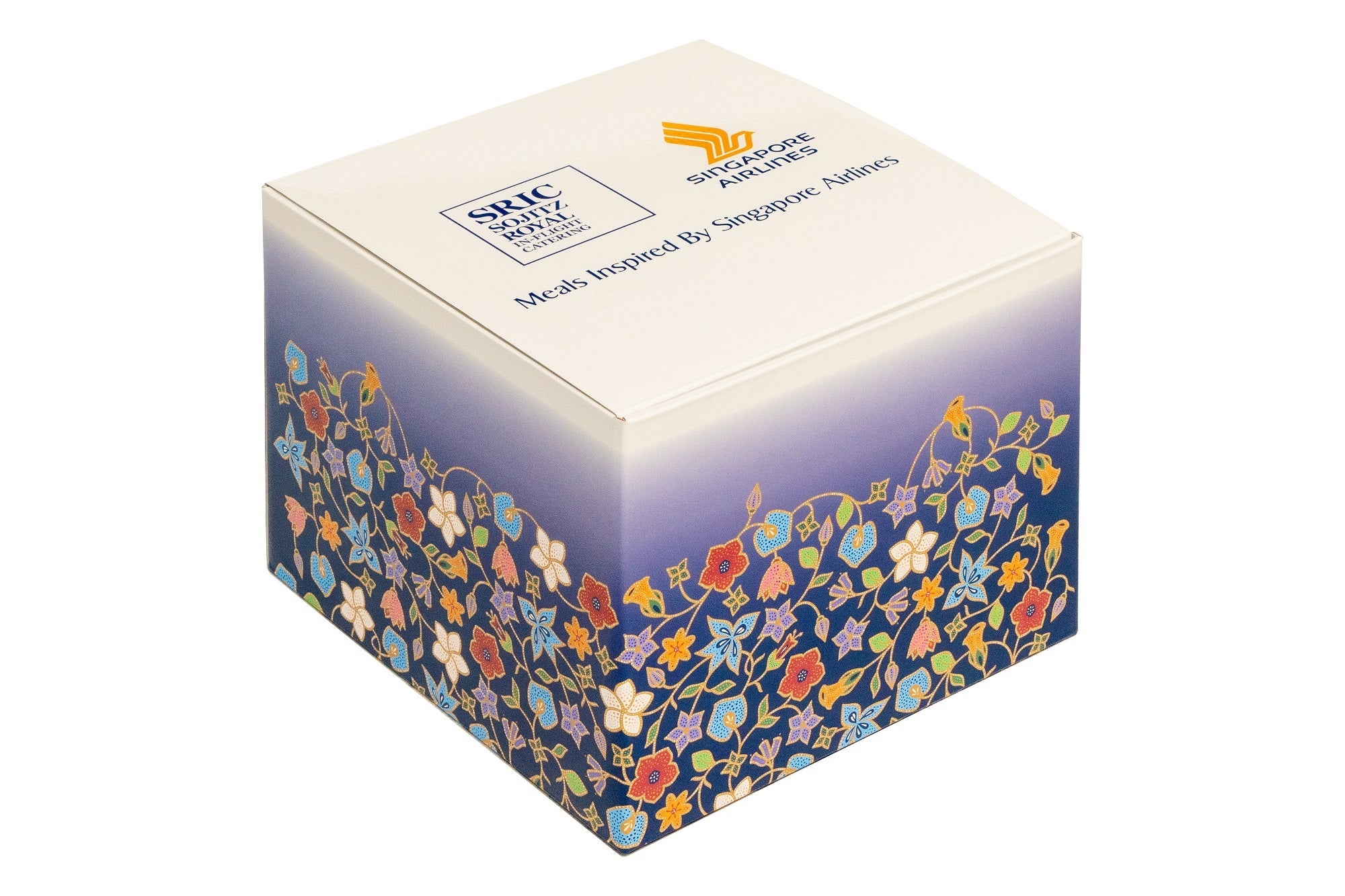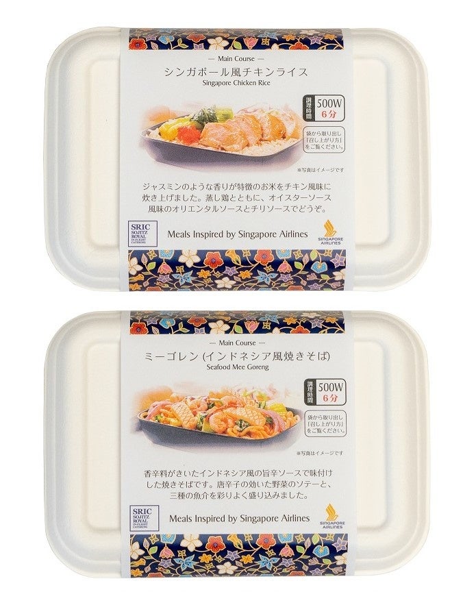 関西国際空港、福岡空港、那覇空港においてファーストクラスからエコノミークラスまで、質の高い機内食を国内外 40 社以上の航空会社に向け調製・搭載している、双日ロイヤルインフライトケイタリング株式会社が製造し、シンガポール航空と共同で提供しているお食事です。パッケージは、シンガポール航空のバティック柄をもとに特別にデザインされ、サステナビリティにもこだわり、環境への負荷を減らすためリサイクルされた素材をできる限り使用したエコな容器や箱を使用しています。