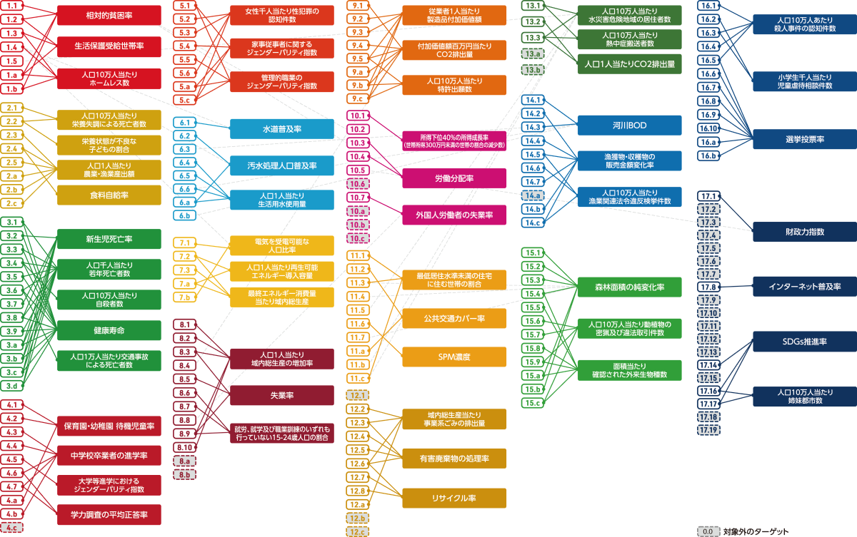 SDGsの169ターゲットのうち、地方自治体レベルで対処可能な142ターゲットを対象としたうえで、これらを56指標に集約して評価しています。