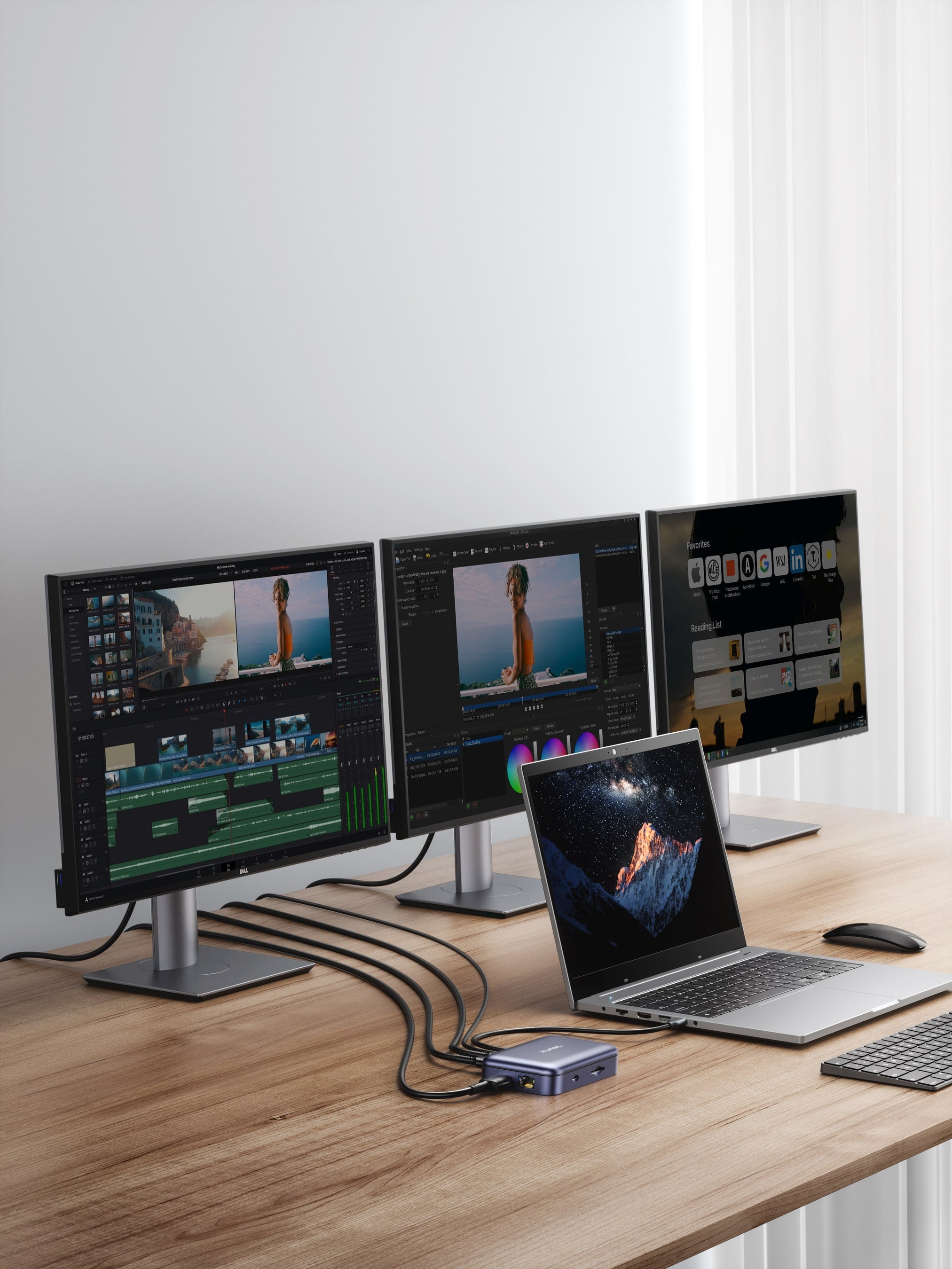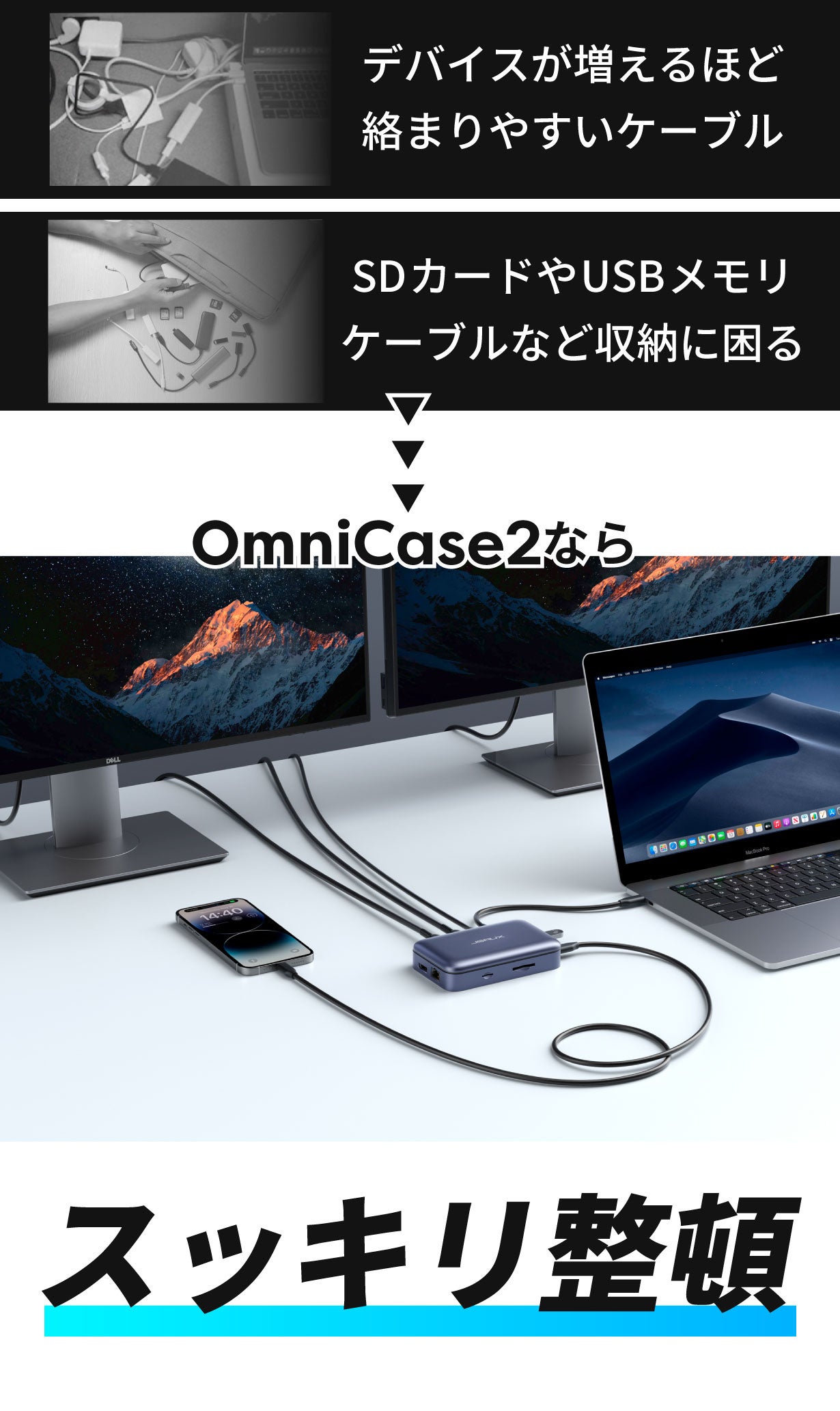 その名の通りすべてを一つにまとめてくれる素晴らしいツールです。無秩序に絡まったケーブルにさよならを告げ、スッキリとしたデスク環境を実現します。必要な接続が一つの場所にすべてまとまっているので、仕事への集中を高めてくれます。また、付属アダプターや記録メディアの収納もバッチリです。