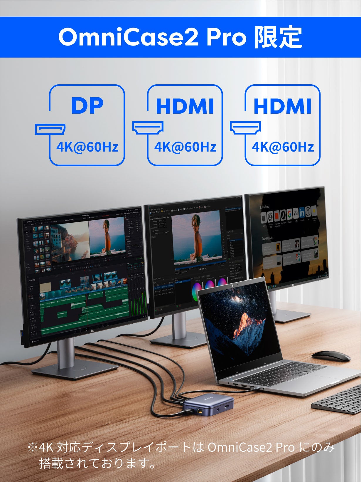 OmniCase 2Proは4Kトリプルディスプレイをサポートします。これにより、クリエイティブな作業や映像編集など、高解像度が必要な作業も一つのドッキングステーションで完結します。鮮明な画像で作業を進め、最高の結果を得ましょう。※4K対応ディスプレイポートはOmni Case2 Proのみに搭載されております。