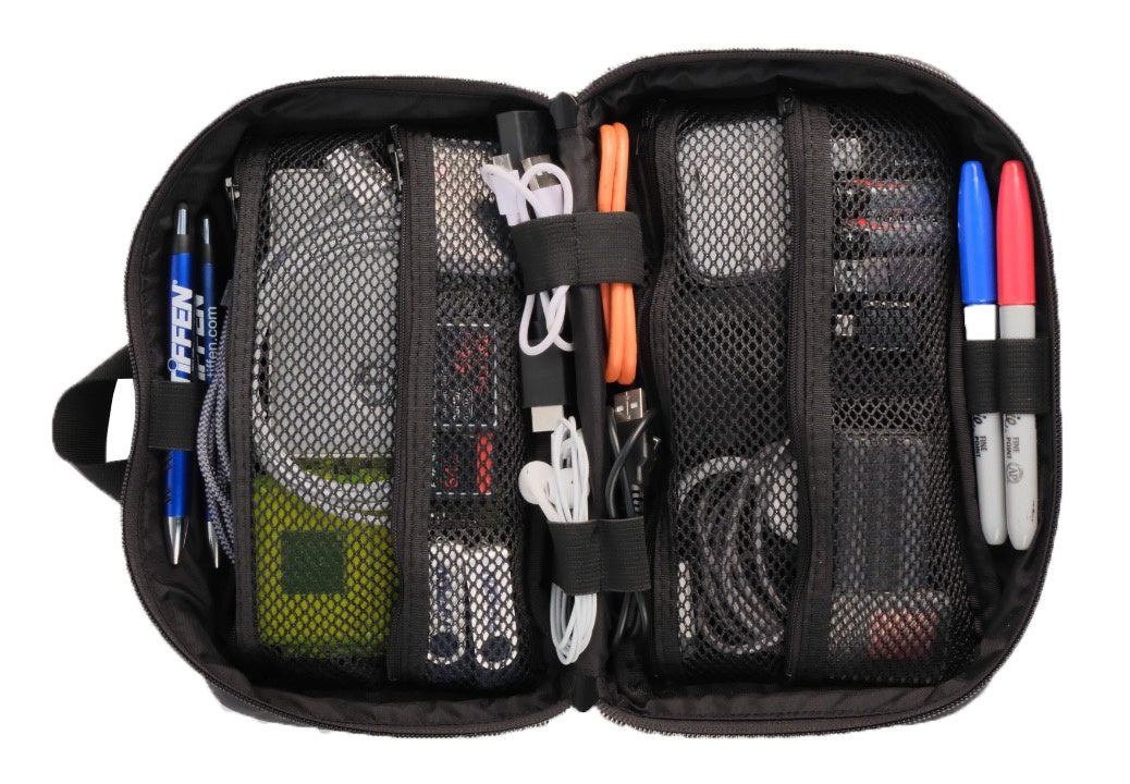 ドンケ テクポーチは、小さなメモリーカードから大きめのポータブルHDDまで、さまざまなアクセサリーを整理整頓して収納できるポーチです。