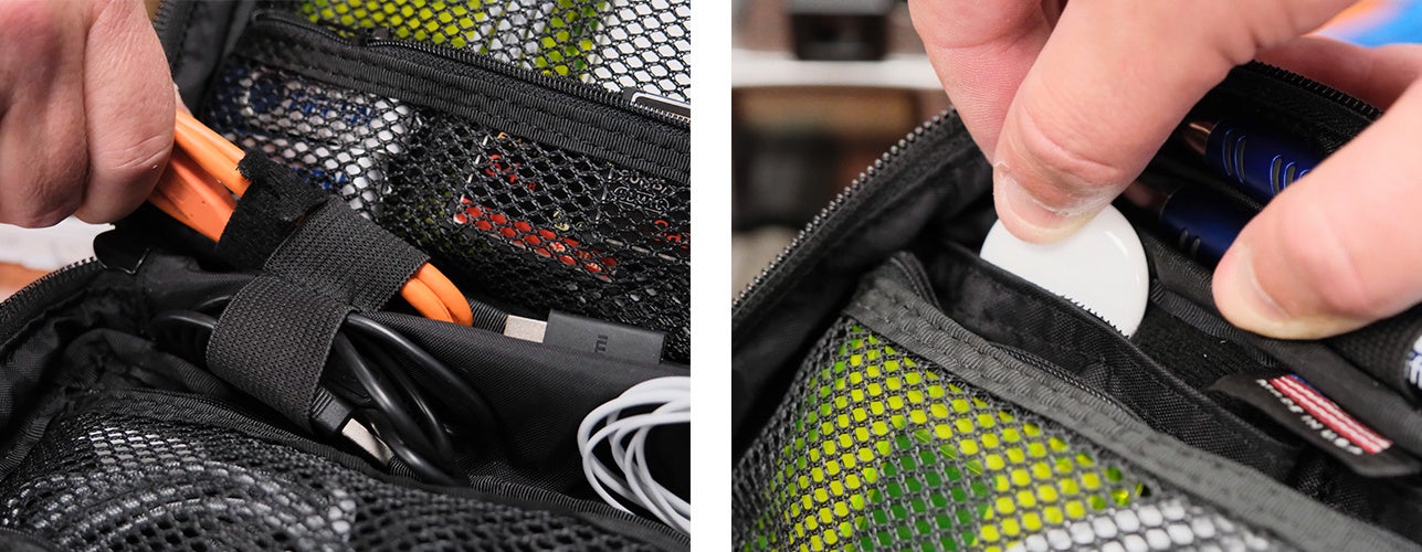 バッグ前面にはアクセサリー用のコンパートメントがあります。中にはジッパー付きのメッシュポケットが複数備わり、バッテリーやケーブルなどを整理して収納できます。また、ケーブルループにはケーブルやボールペン、その他アクセサリーを差し込めます。ベルクロ付きのポケットは目立たない位置にあるため、AirTagなどセキュリティ度の高いアイテムの収納に便利です。