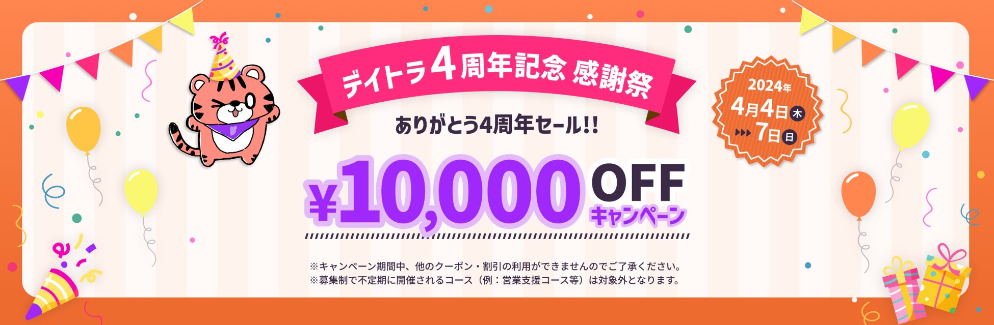 2024年4月4日、オンラインスクール”デイトラ”は開講から4周年を迎えました。日頃の感謝の気持ちを込めて、受講料1万円OFFセールを開催します。