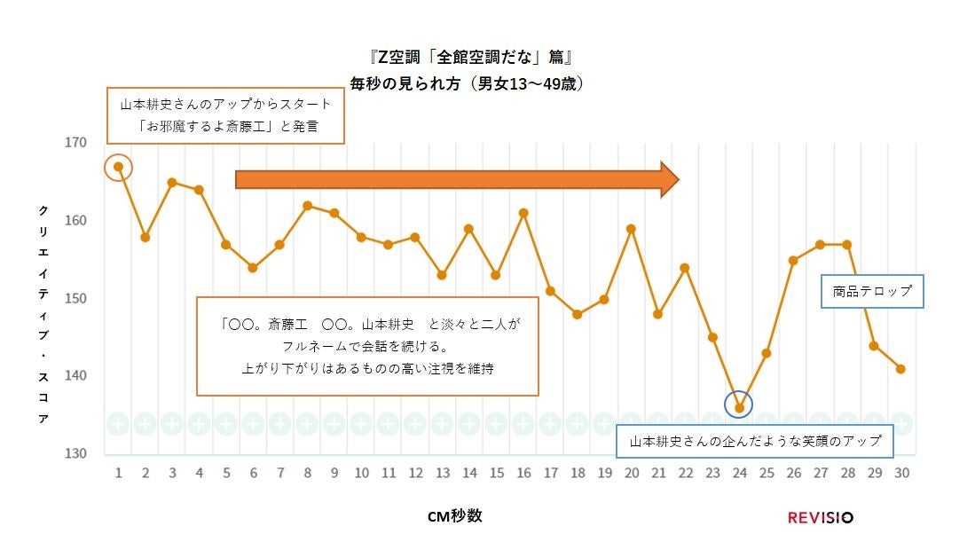 このCMは、前述したとおり斎藤工さんと、山本耕史さんが本人役で共演しています。REVISIO計測による1秒毎のデータをみてみると、一番みられたシーンは冒頭の1秒目でしたが、すべてのセリフでお互いの名前を呼び合う“フルネーム呼び捨て構文”が最後まで視聴者の目を惹きつけました。下降傾向になりがちな多くのCMと比べ、後半まで高い水準を維持していることがわかります。