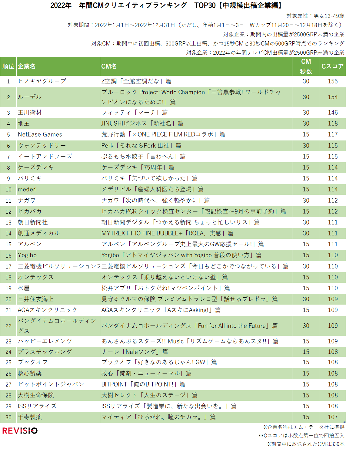 REVISIO株式会社、2022年年間で視聴者の視線を釘付けにしたテレビCMクリエイティブのランキング「2022年 年間CMクリエイティブCスコアランキングTOP30【中規模出稿企業編】」を公開しました。