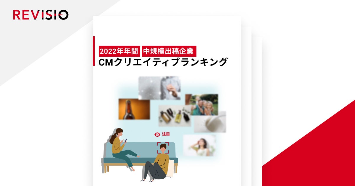 ご家庭に人体認識技術を搭載した機器を設置し、テレビの「視られている量」を測るREVISIO株式会社(所在地 :東京都千代田区、代表取締役社長 郡谷 康士、以下REVISIO)は、 テレビCMを中規模出稿している企業に絞り、2022年年間で視聴者の視線を釘付けにしたテレビCMクリエイティブのランキング「2022年 年間CMクリエイティブCスコアランキングTOP30【中規模出稿企業編】」を公開しました。