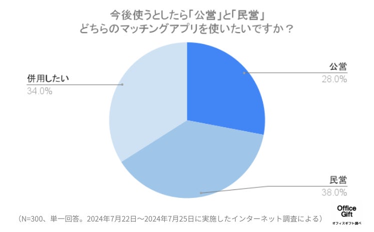 結果は、28%が「公営」のマッチングアプリを利用したいと回答し、38%が「民営」、34%は「併用したい」と回答しました。