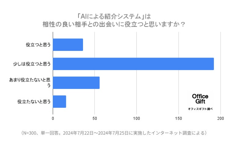 AIによる紹介システムが相性の良い相手との出会いに「少しは役立つと思う」と回答した方が圧倒的に多く192名で、「役立つと思う」と回答した方は36名、合わせると回答者の76%にのぼります。