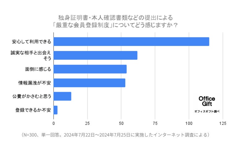 独身証明書や本人確認書類の提出が必要な「厳重な会員登録制度」に対しては、「安心して利用できる」と回答した方が115名、「誠実な相手と出会えそう」と回答した方が62名と、肯定派が目立ちました。
