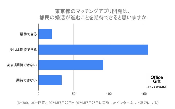 続いて、「東京都のマッチングアプリ開発は、都民の婚活が進むことを期待できると思いますか」とお聞きしたところ、「期待できる」と回答した方は19名にとどまりましたが、「少しは期待できる」と答えた方が最も多く、156名でした。2つを期待できる派とすると58.3%にのぼります。