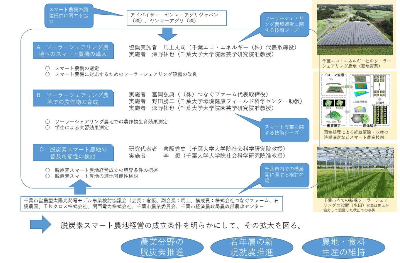 倉阪プロジェクト(ソーラーシェアリングを活用した自立型脱炭素スマート農地の確立と展開)は,上記の2つのフェーズのうちのソリューション創出フェーズに該当し,研究代表者を千葉大学大学院社会科学研究院教授の倉阪秀史が,協働実施者を千葉エコ・エネルギー株式会社代表取締役の馬上丈司が務めます。