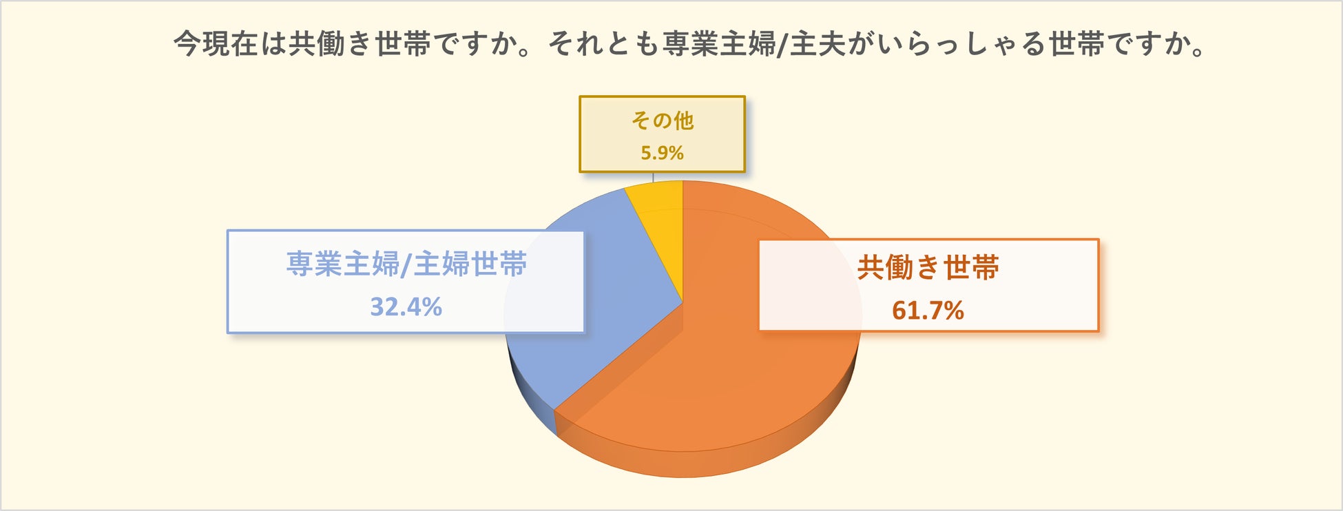 「共働き世帯」が61.7%を集め多数派となり、「専業主婦/主夫世帯がいらっしゃる家庭」は32.4%に留まりました。