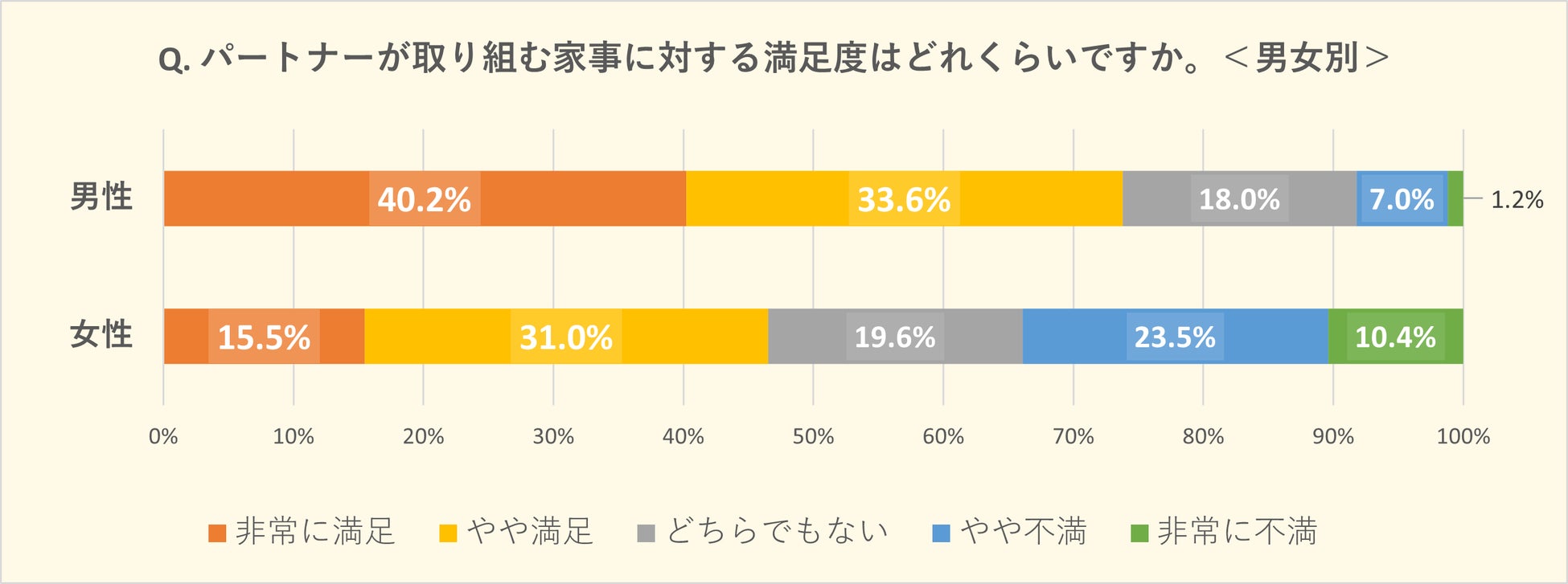 また、女性側が「やや不満」23.5%「非常に不満」10.4%と合計3割以上の方が不満を抱えている現状が浮き彫りになりました。