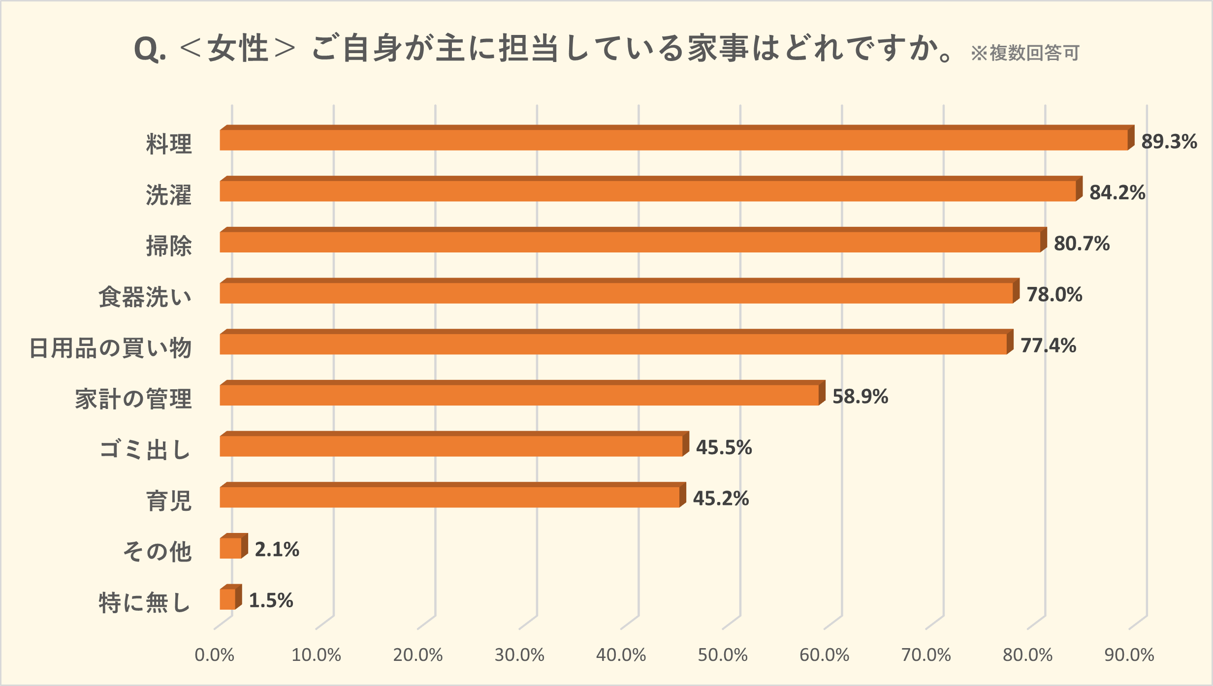 女性目線の回答としては、多くの項目で過半数以上の得票となっており、特に「料理」89.3%、「洗濯」84.2%、「掃除」80.7%の項目については8割以上が回答する圧倒的な割合を記録しました。