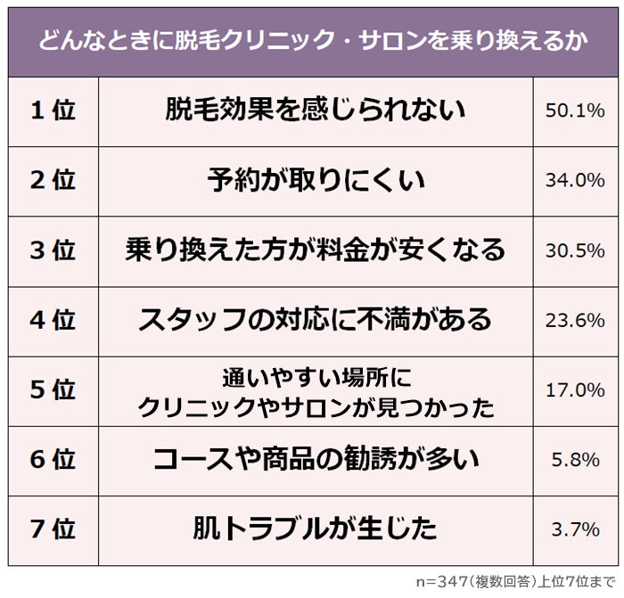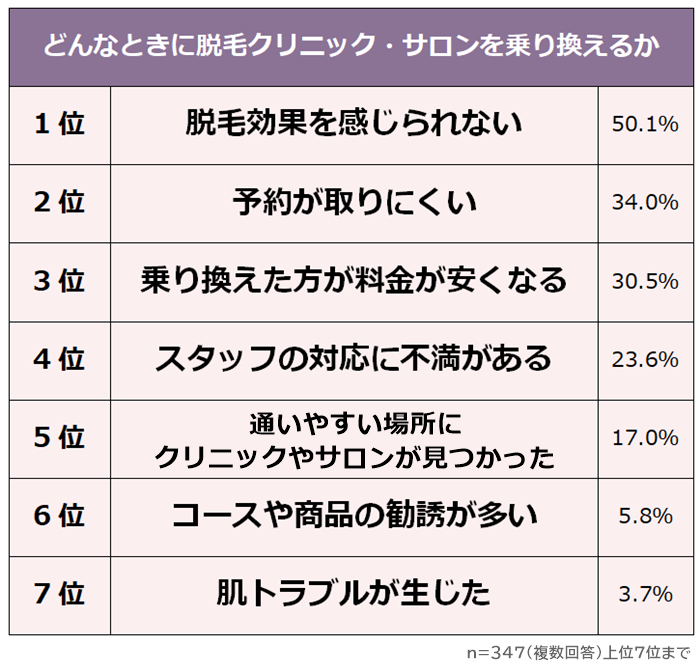 女性347人に、「どんなときに脱毛クリニックやサロンを乗り換えたいと思うか」を聞きました。