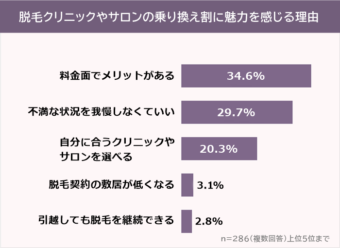 「脱毛クリニックやサロンの乗り換え割に魅力を感じる」と回答した286人に、どのような点に魅力を感じるか聞いたところ、1位は「料金面でメリットがある(34.6%)」でした。